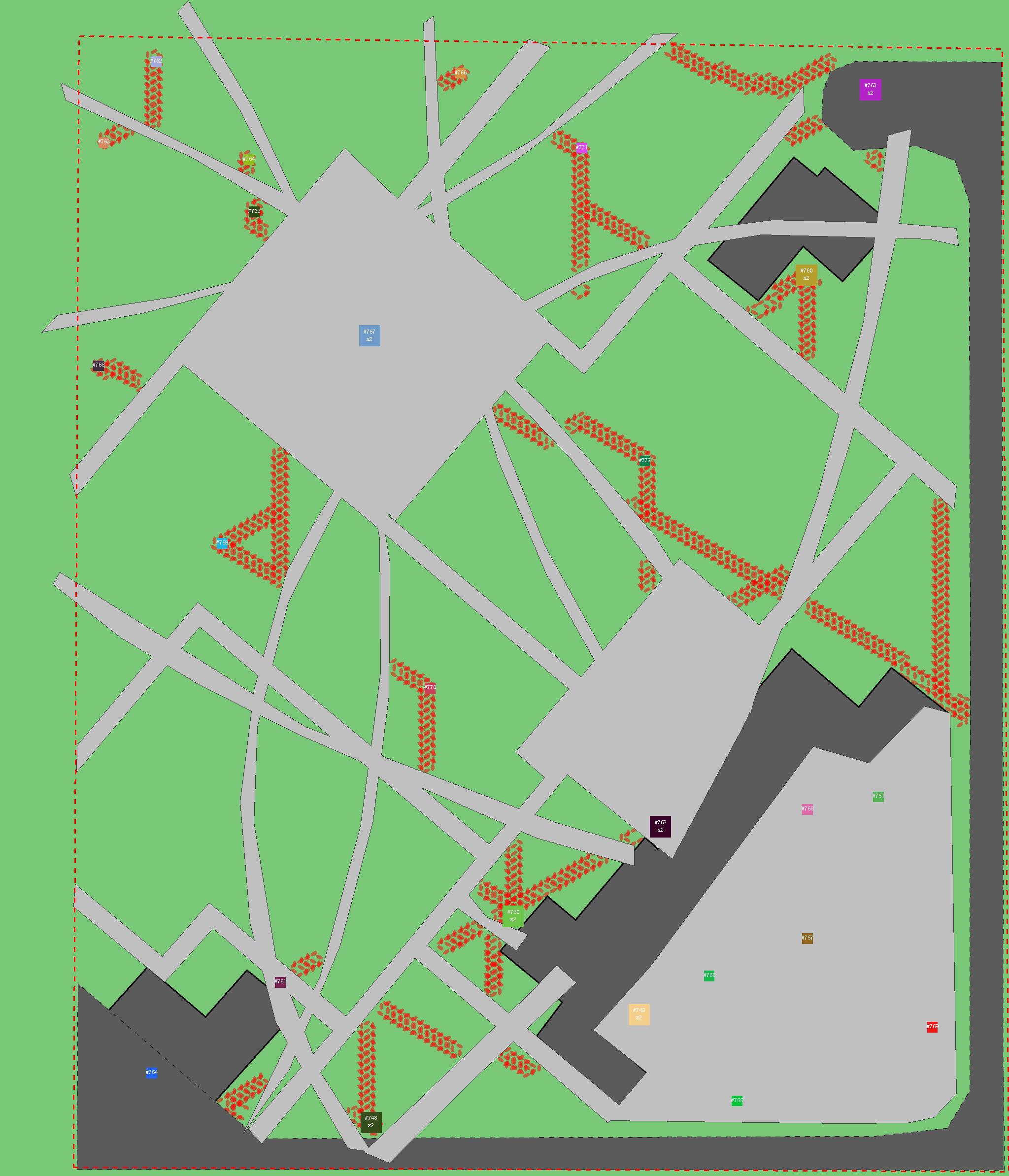 Красным цветом показаны места, где, вероятнее всего, появятся стихийные тропы..