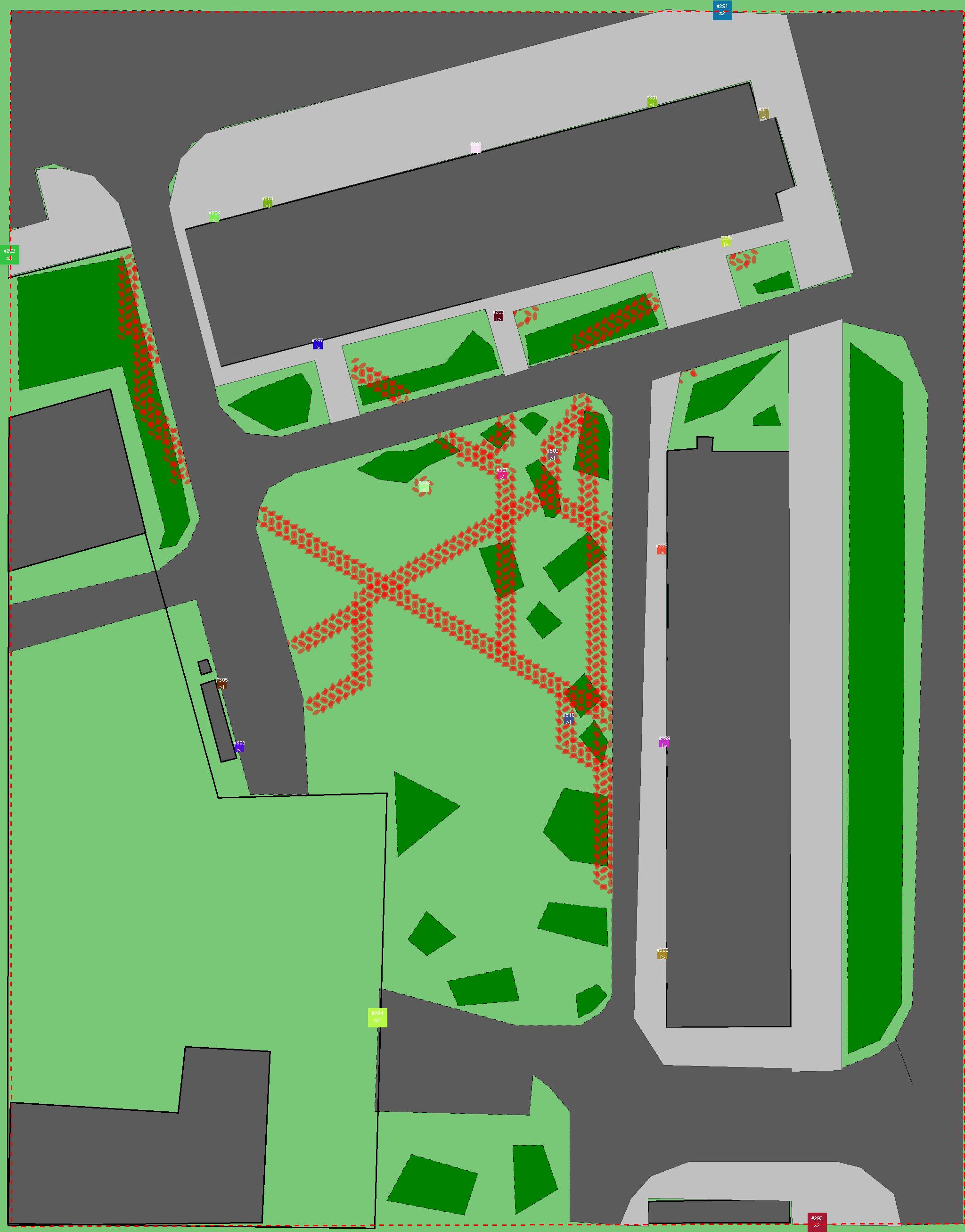 Красным цветом показаны места, где, вероятнее всего, появятся стихийные тропы..