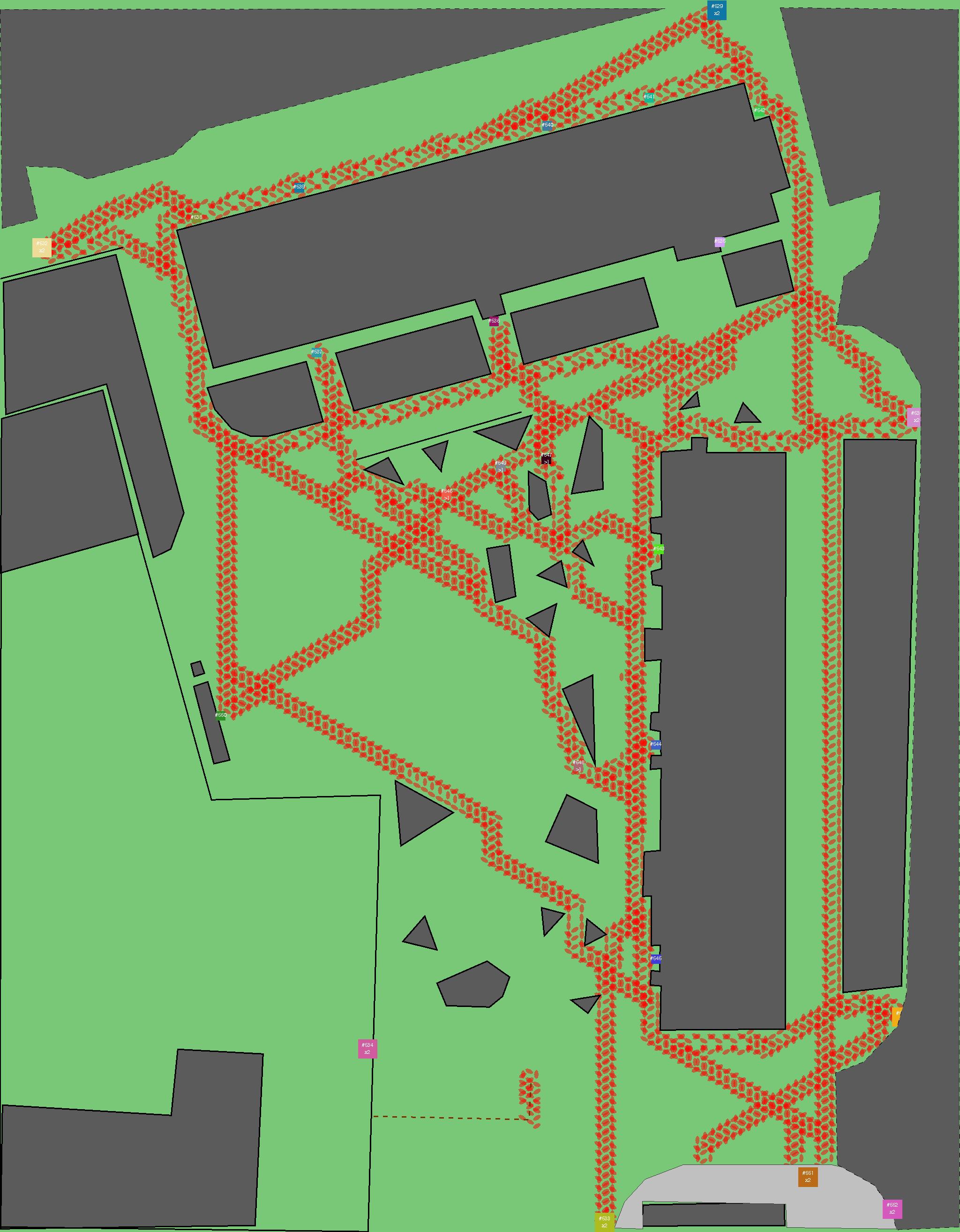 Красным цветом показаны места, где, вероятнее всего, появятся стихийные тропы..
