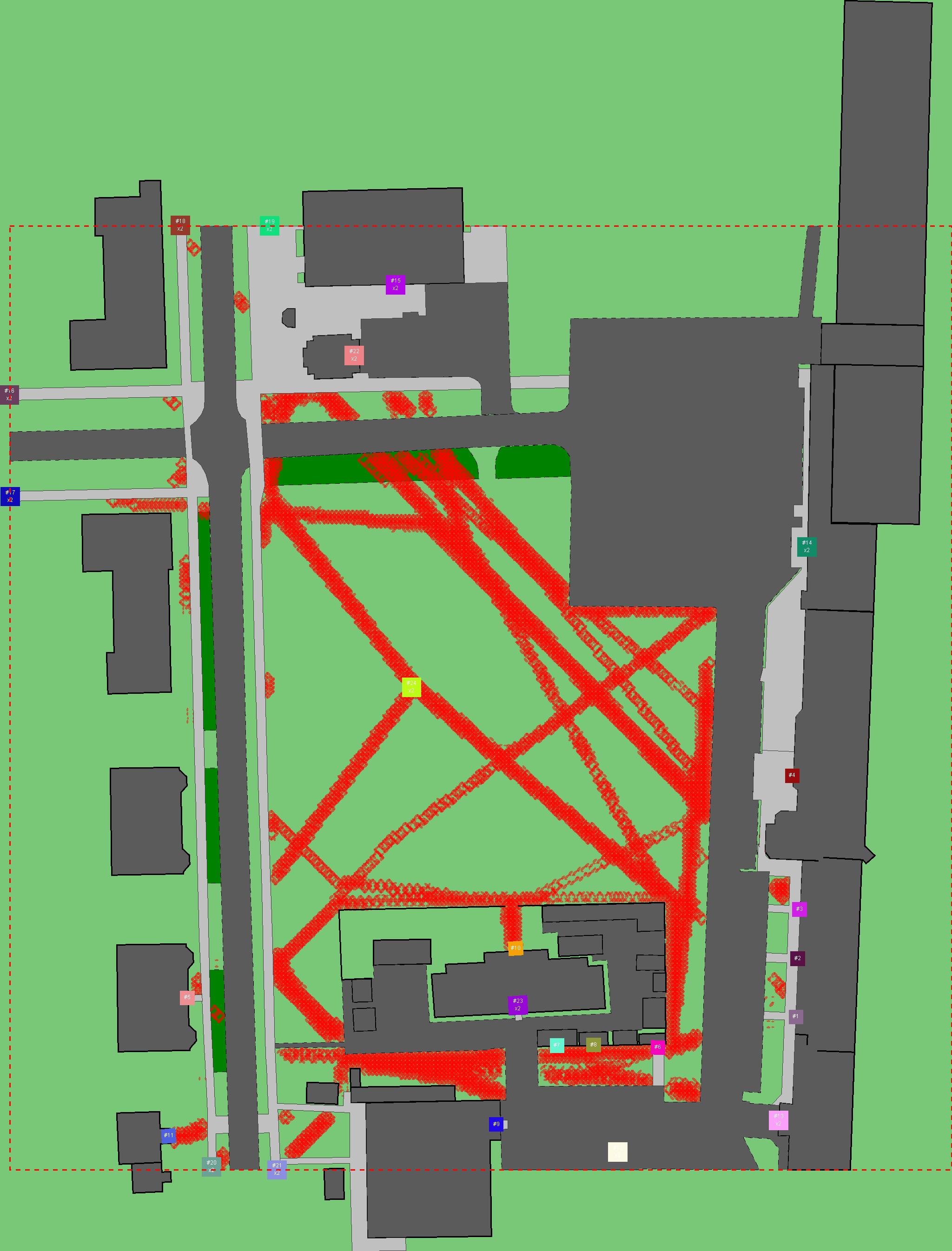 Красным цветом показаны места, где, вероятнее всего, появятся стихийные тропы..