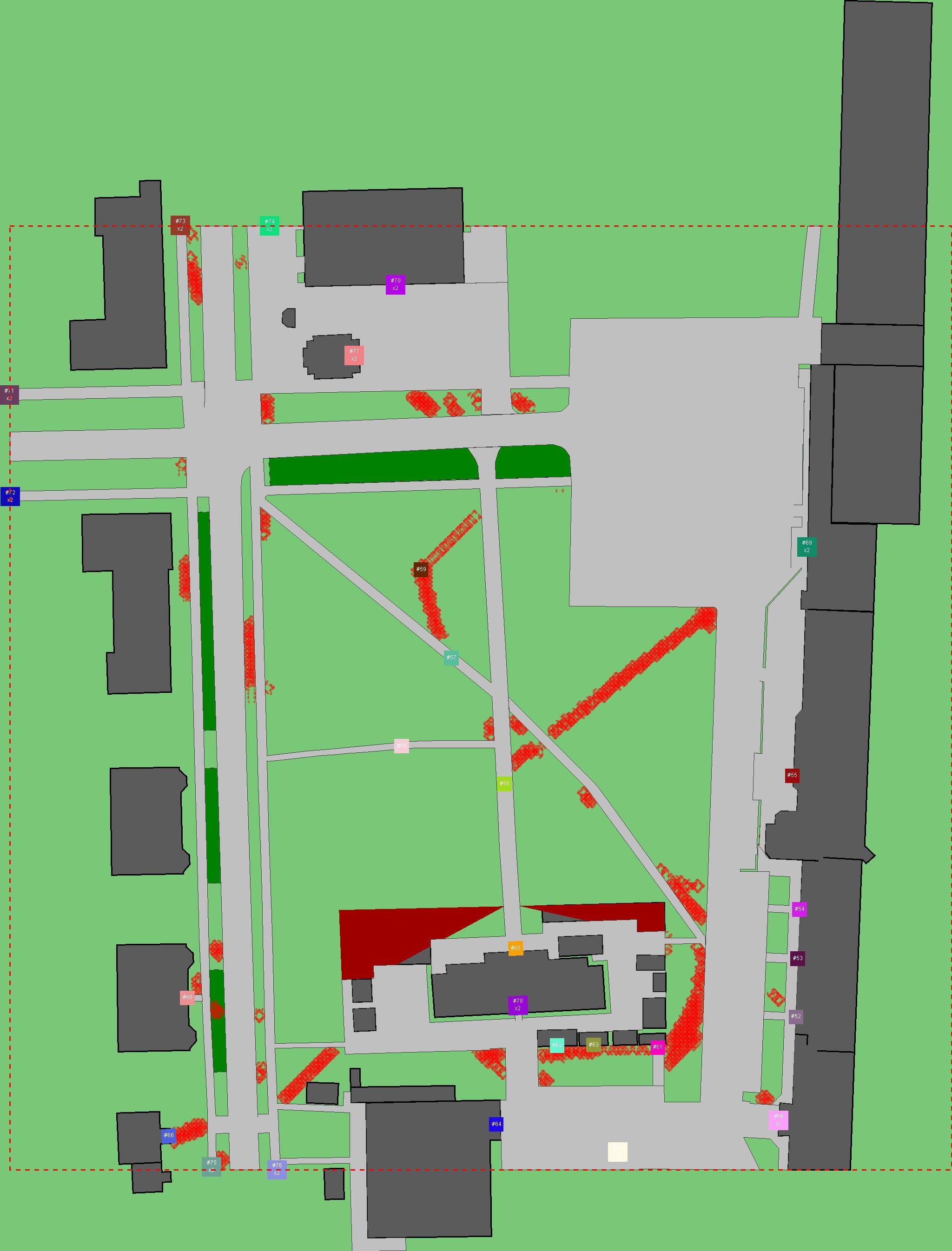 Красным цветом показаны места, где, вероятнее всего, появятся стихийные тропы..
