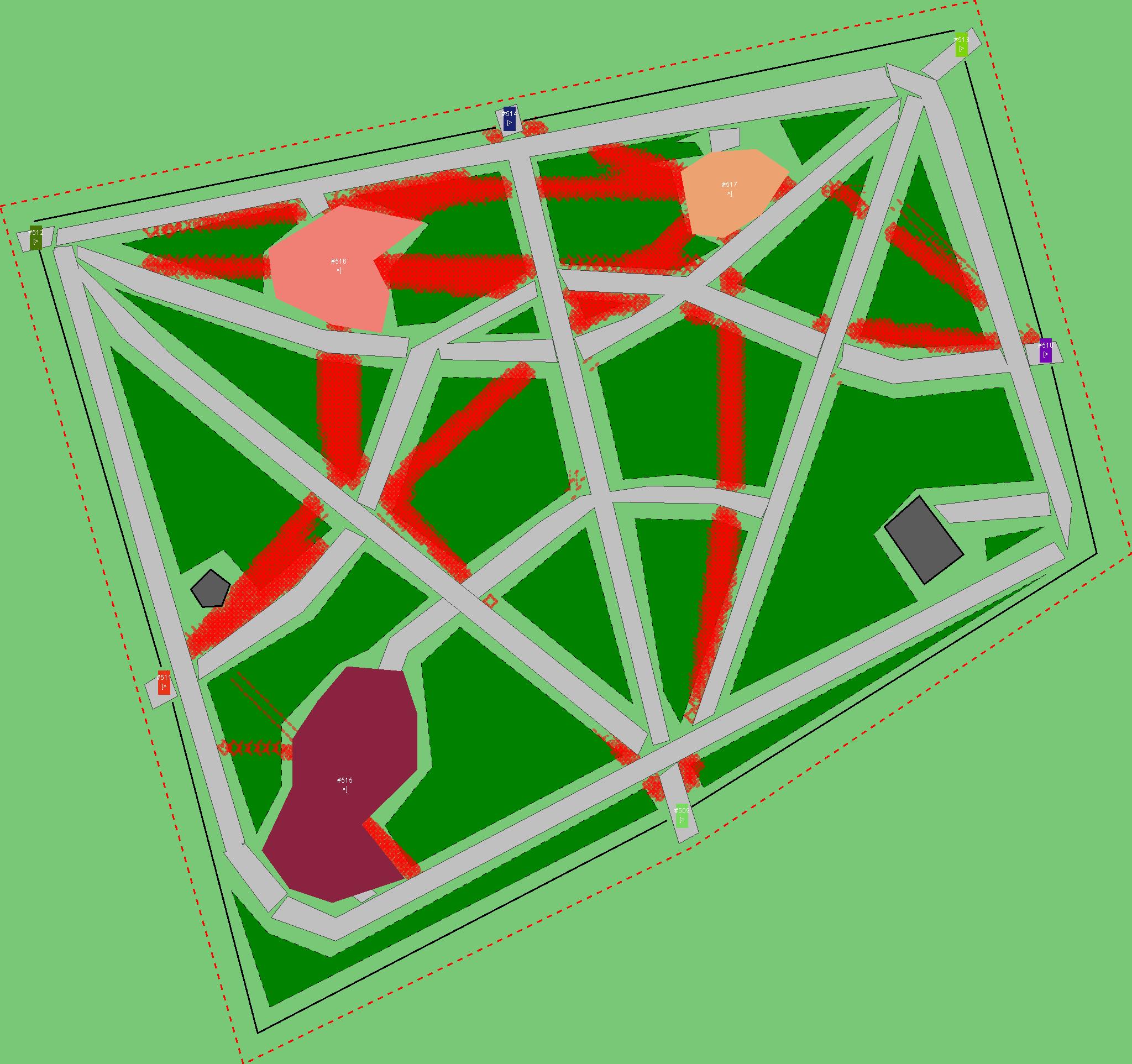 Красным цветом показаны места, где, вероятнее всего, появятся стихийные тропы..