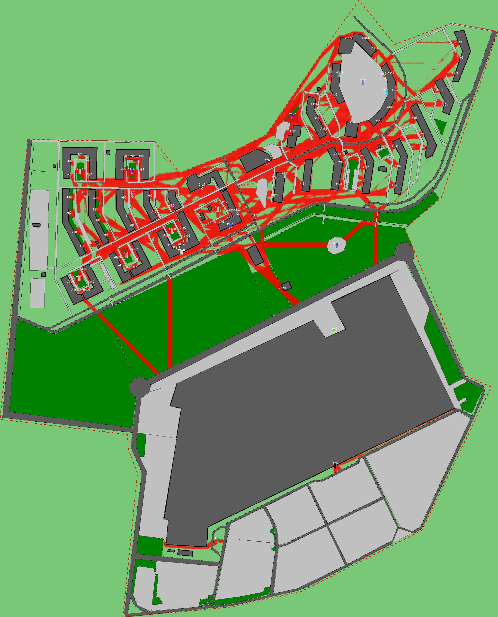 Красным цветом показаны места, где, вероятнее всего, появятся стихийные тропы..