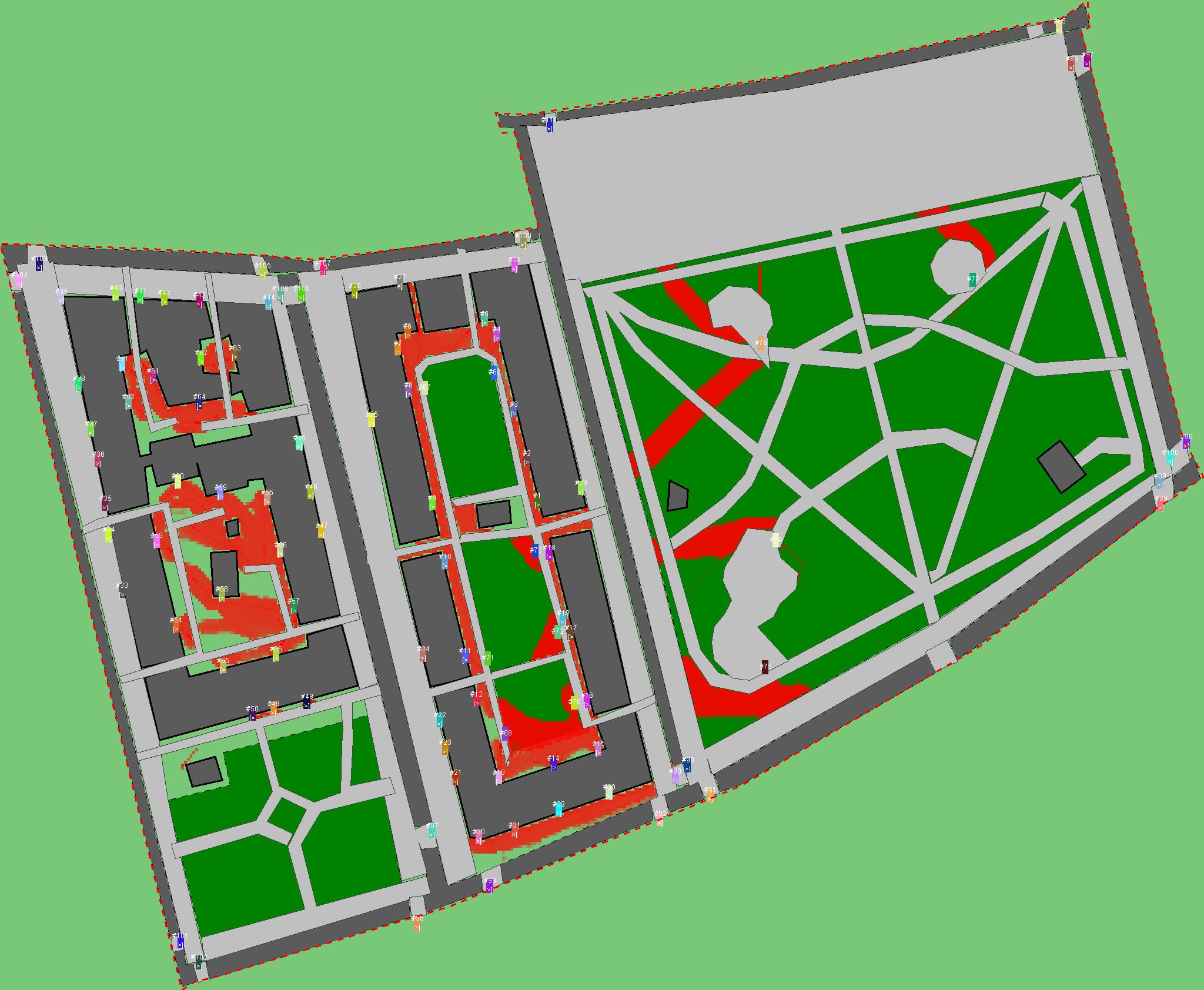 Красным цветом показаны места, где, вероятнее всего, появятся стихийные тропы..