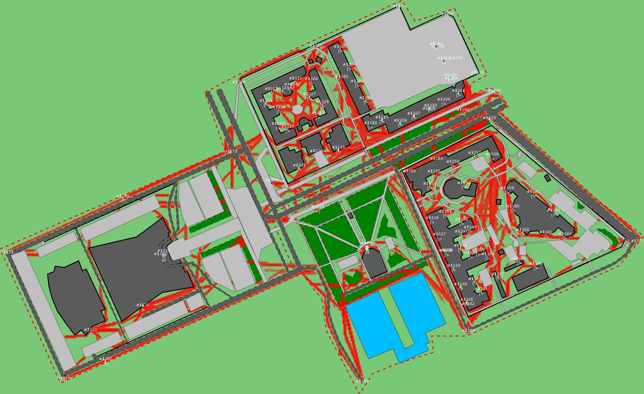 Красным цветом показаны места, где, вероятнее всего, появятся стихийные тропы..
