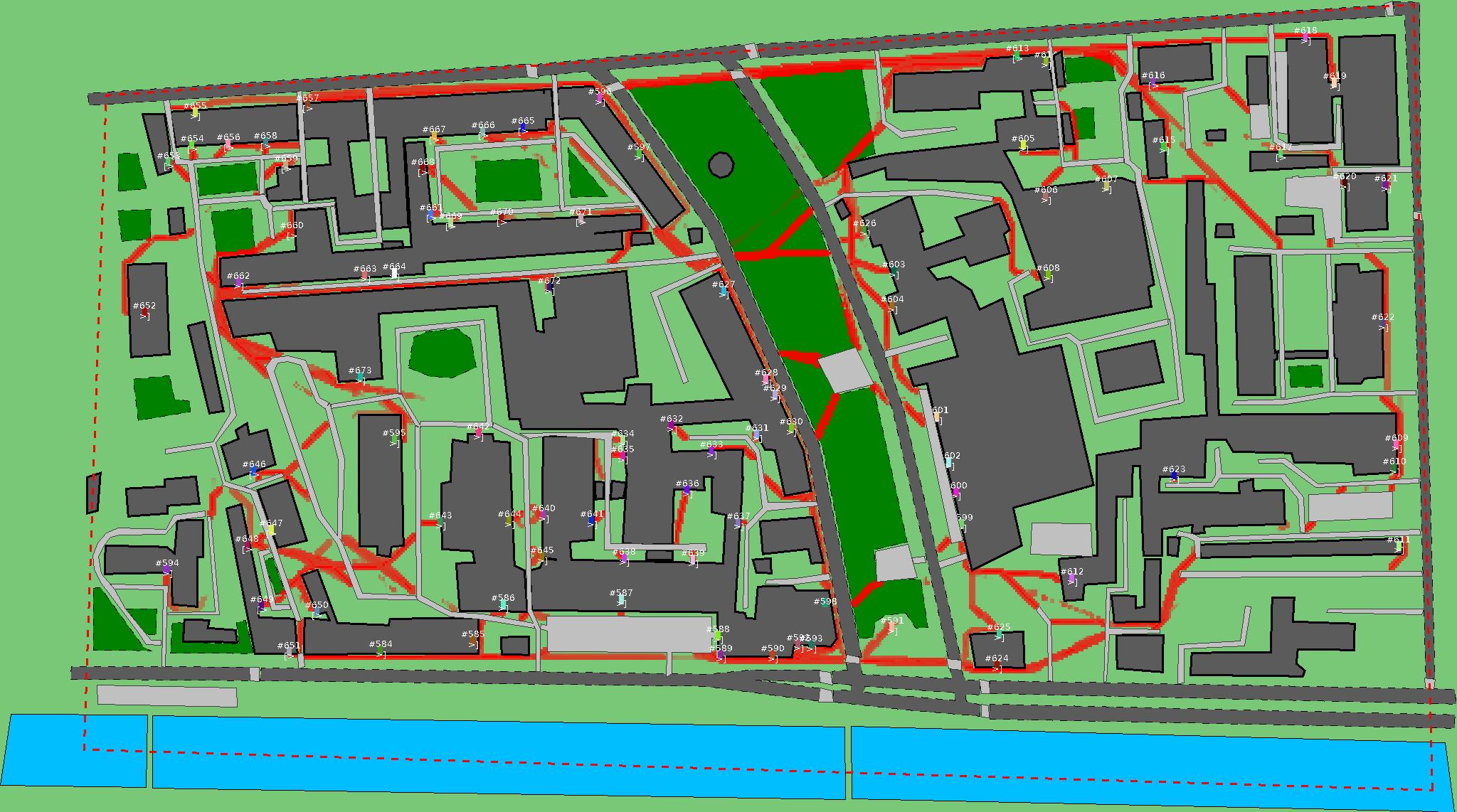 Красным цветом показаны места, где, вероятнее всего, появятся стихийные тропы..
