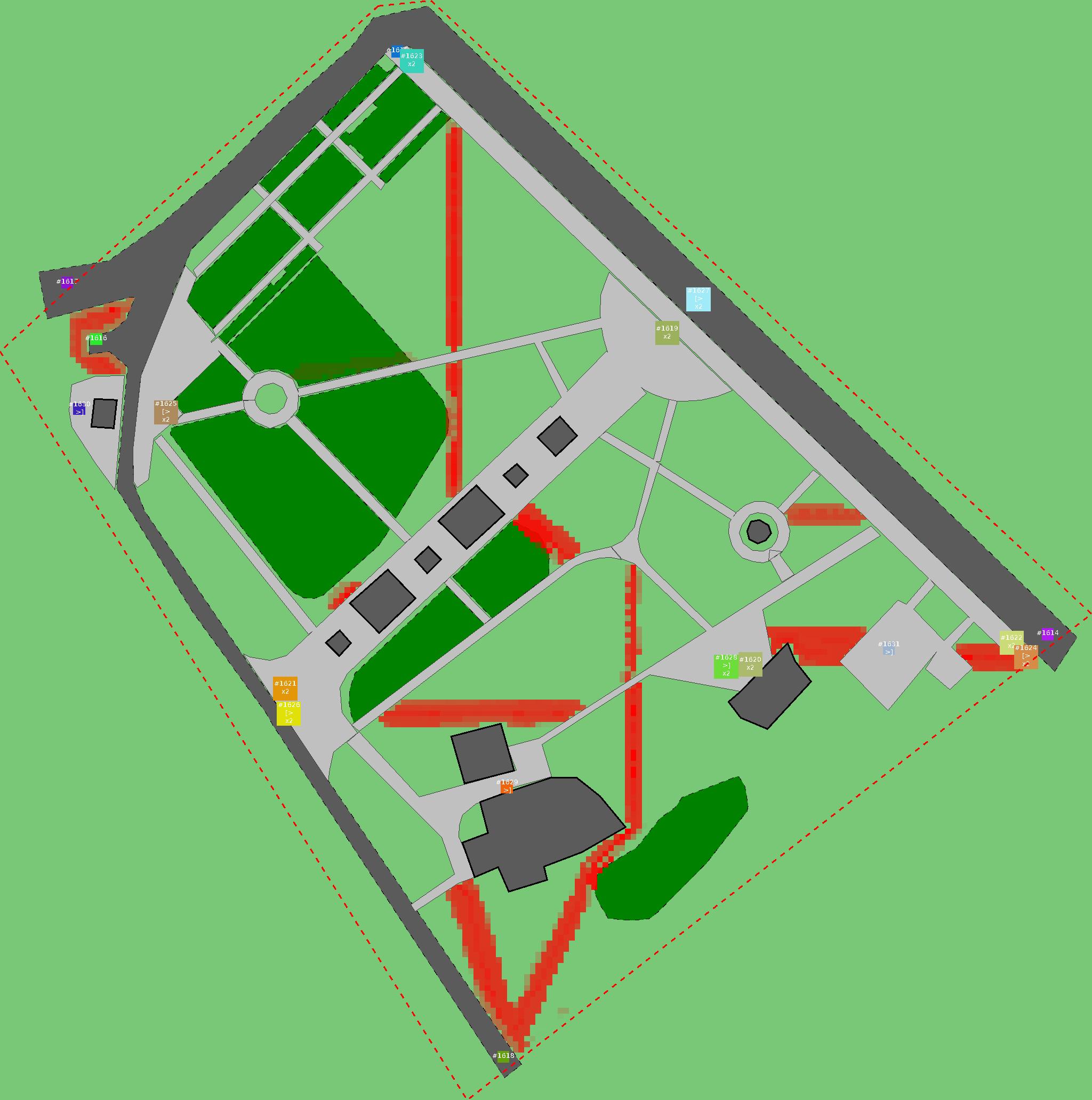 Красным цветом показаны места, где, вероятнее всего, появятся стихийные тропы..