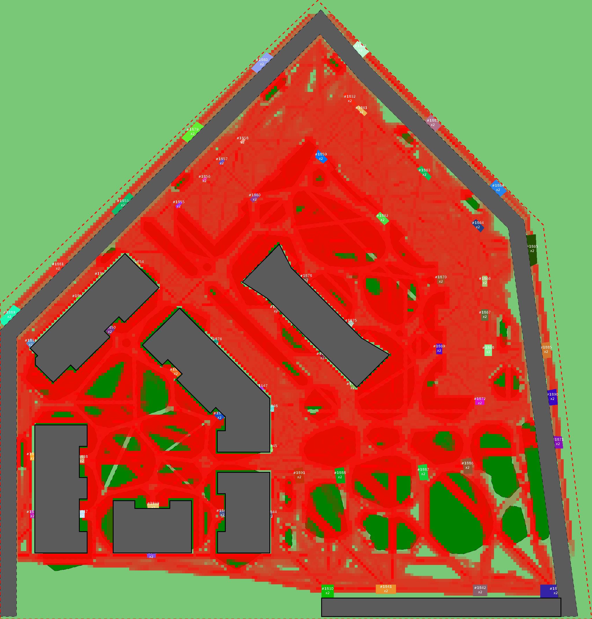 Красным цветом показаны места, где, вероятнее всего, появятся стихийные тропы..
