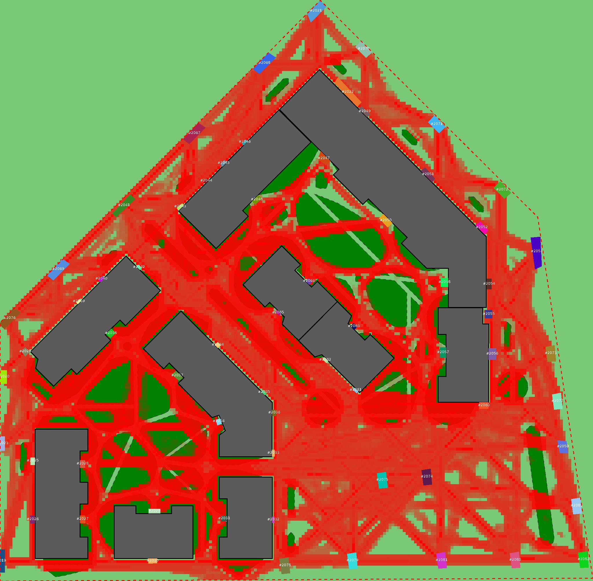 Красным цветом показаны места, где, вероятнее всего, появятся стихийные тропы..