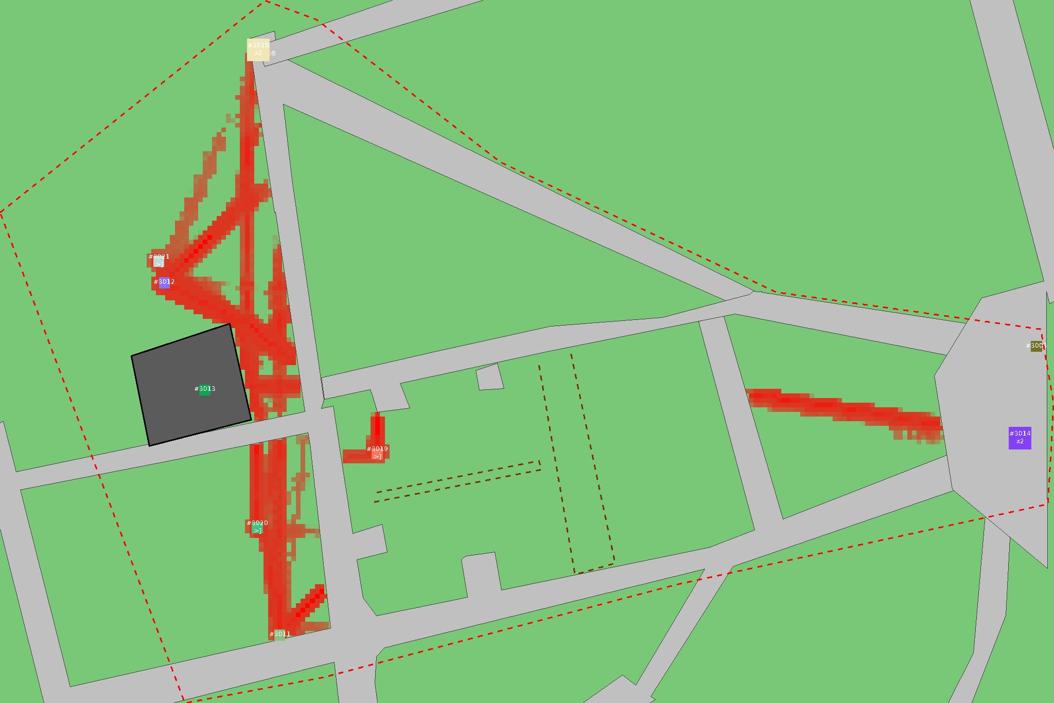 Красным цветом показаны места, где, вероятнее всего, появятся стихийные тропы..