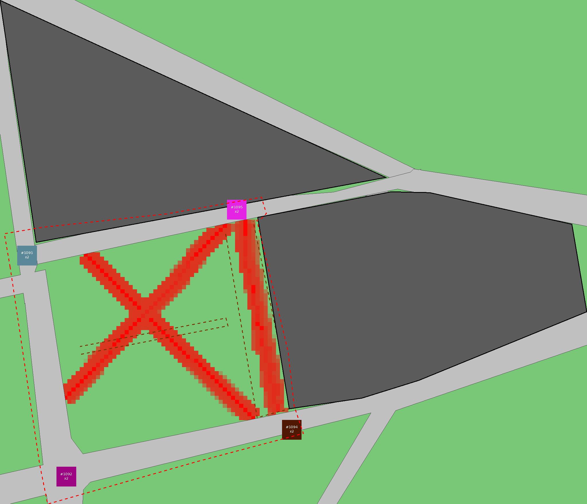 Красным цветом показаны места, где, вероятнее всего, появятся стихийные тропы..