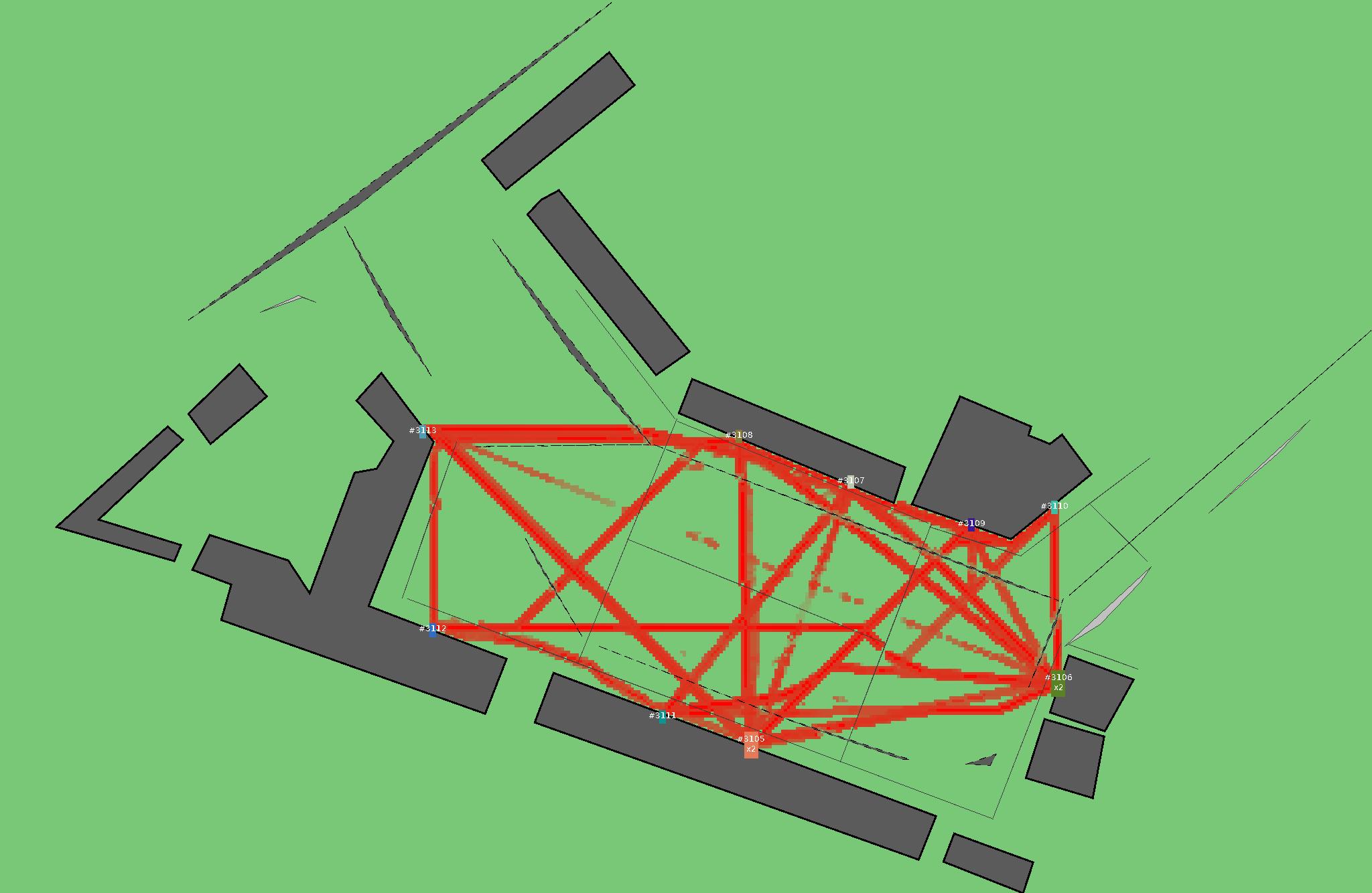 Красным цветом показаны места, где, вероятнее всего, появятся стихийные тропы..