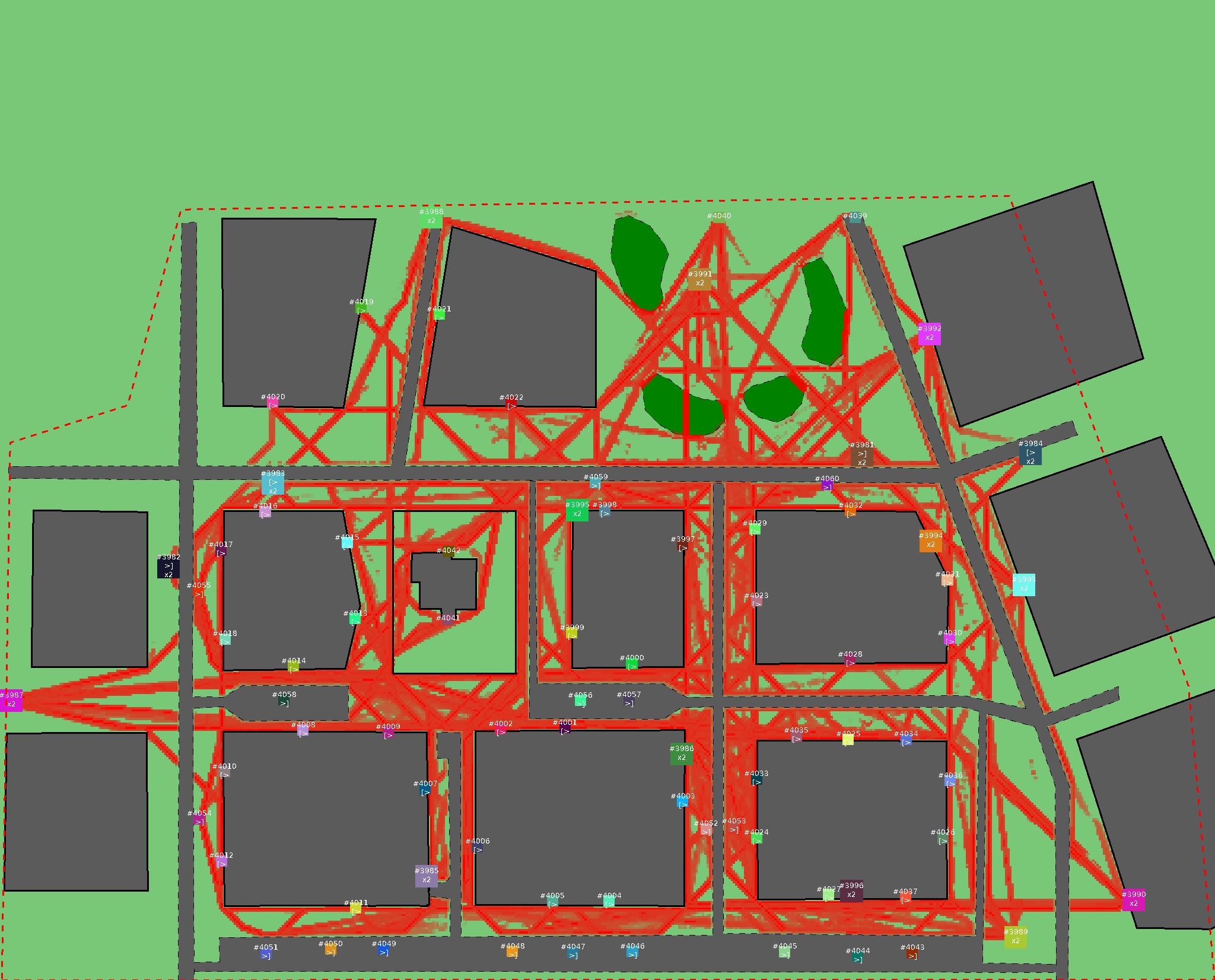 Красным цветом показаны места, где, вероятнее всего, появятся стихийные тропы..