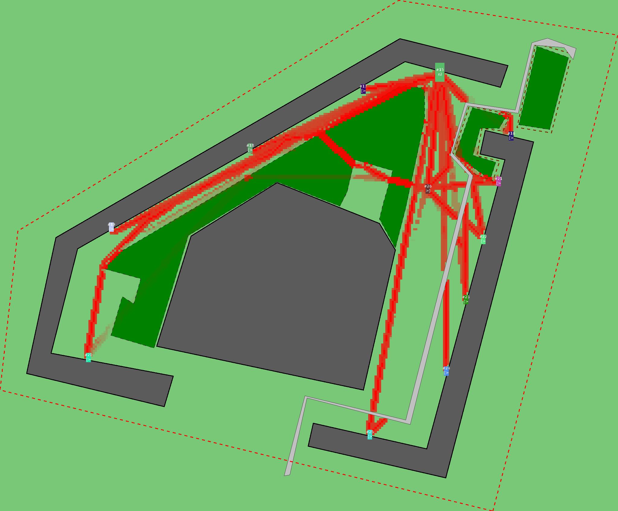 Красным цветом показаны места, где, вероятнее всего, появятся стихийные тропы..