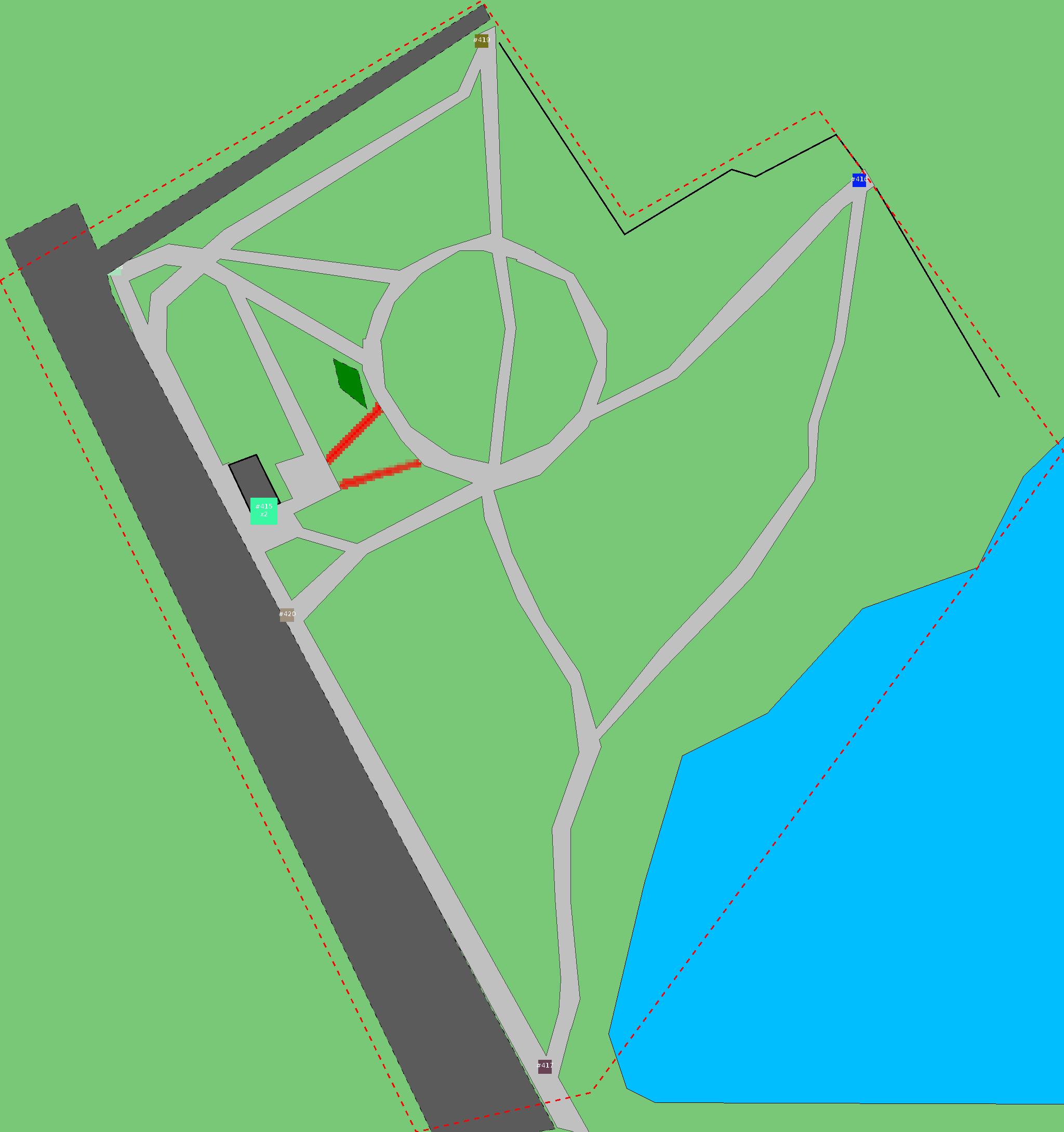 Красным цветом показаны места, где, вероятнее всего, появятся стихийные тропы..