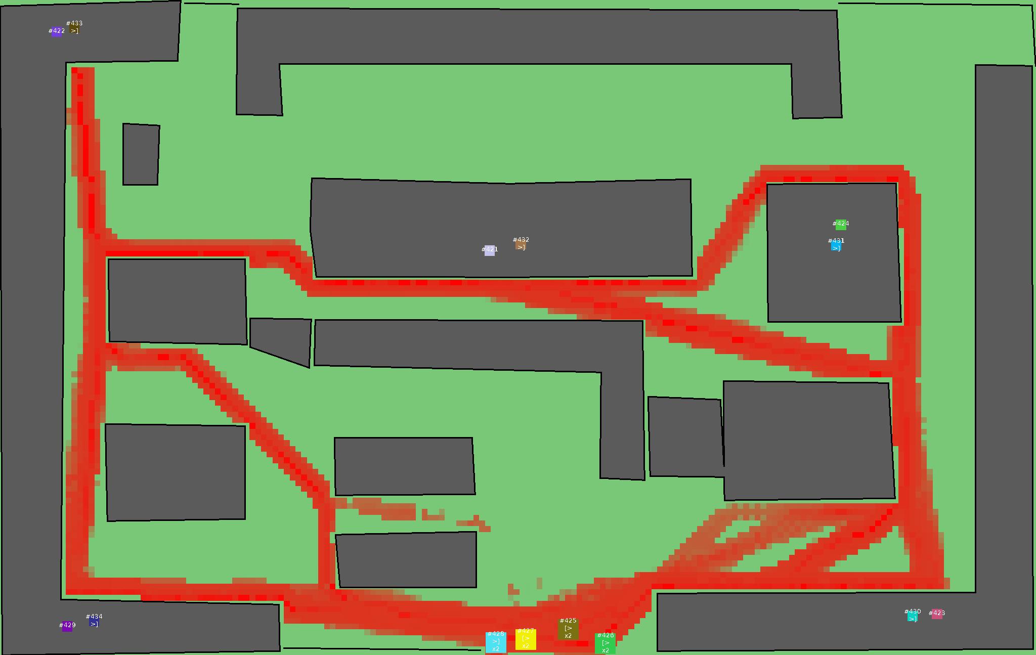 Красным цветом показаны места, где, вероятнее всего, появятся стихийные тропы..