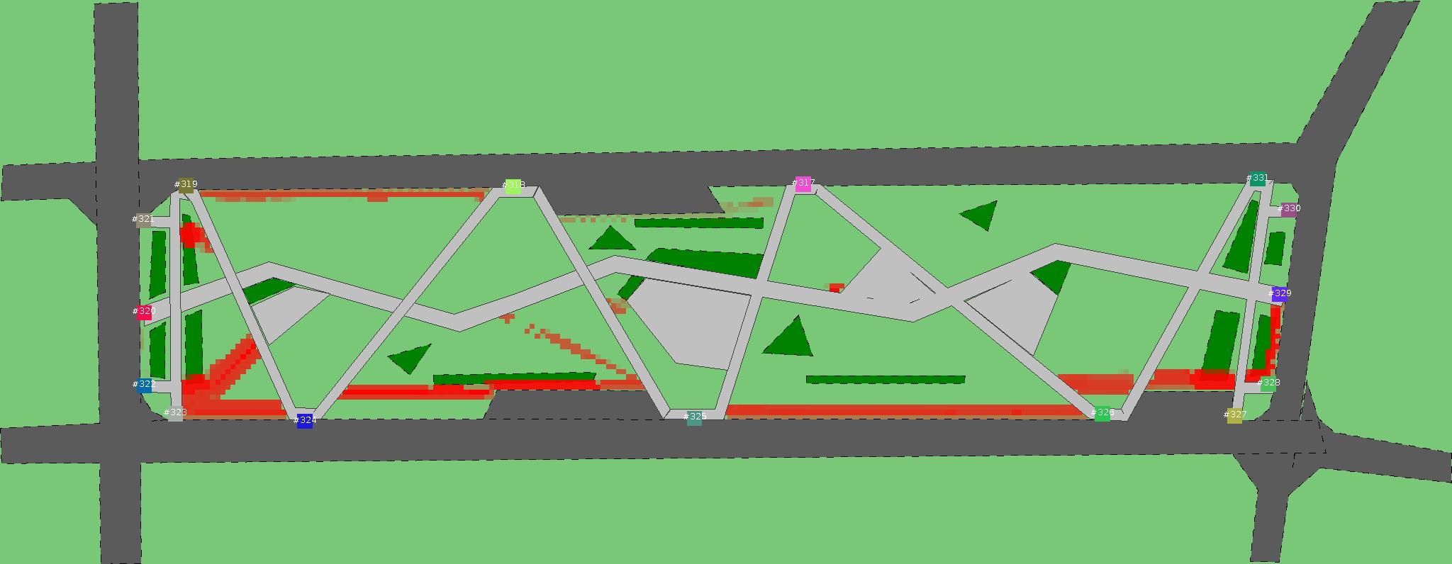 Красным цветом показаны места, где, вероятнее всего, появятся стихийные тропы..