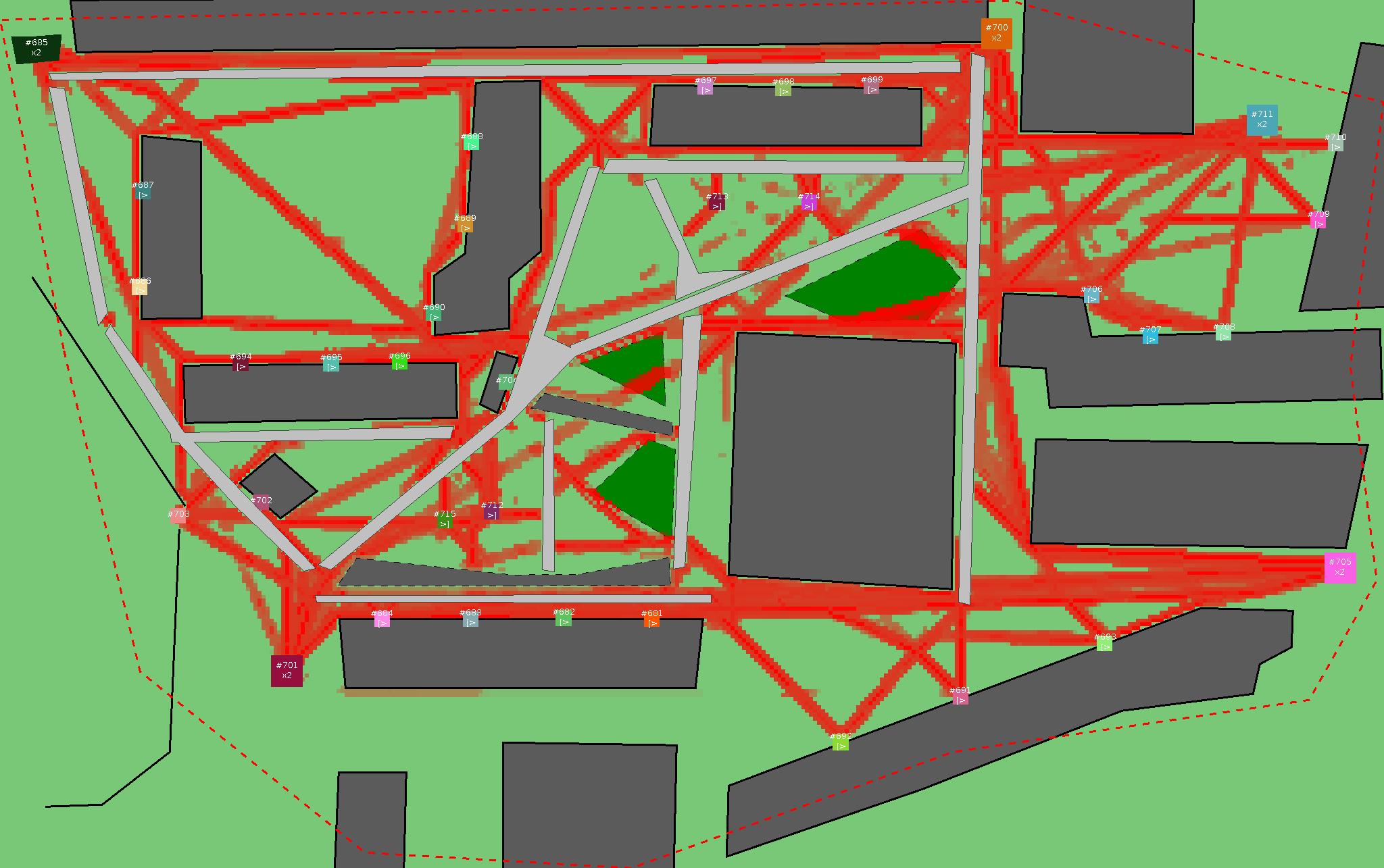 Красным цветом показаны места, где, вероятнее всего, появятся стихийные тропы..