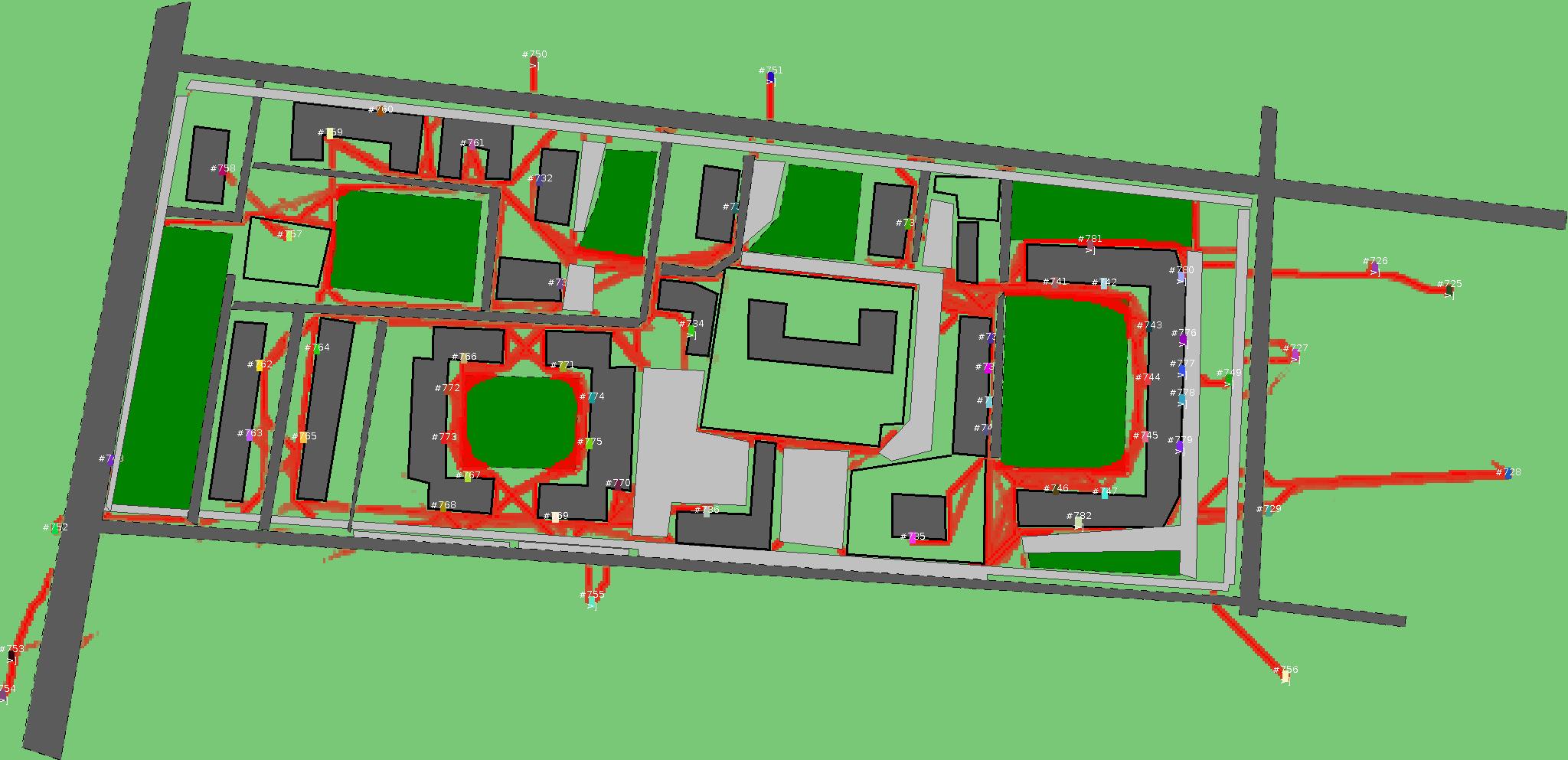 Красным цветом показаны места, где, вероятнее всего, появятся стихийные тропы..