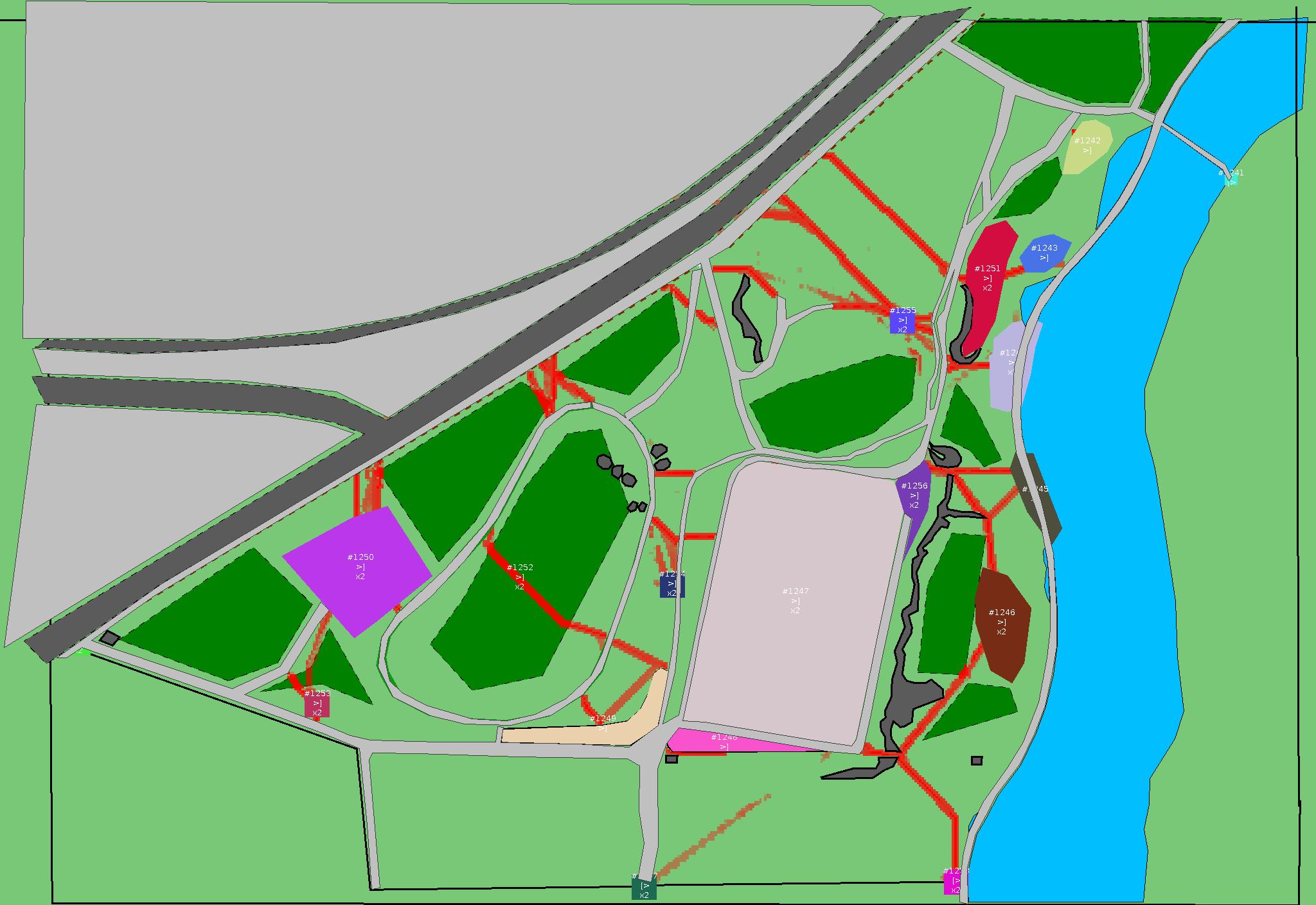 Красным цветом показаны места, где, вероятнее всего, появятся стихийные тропы..