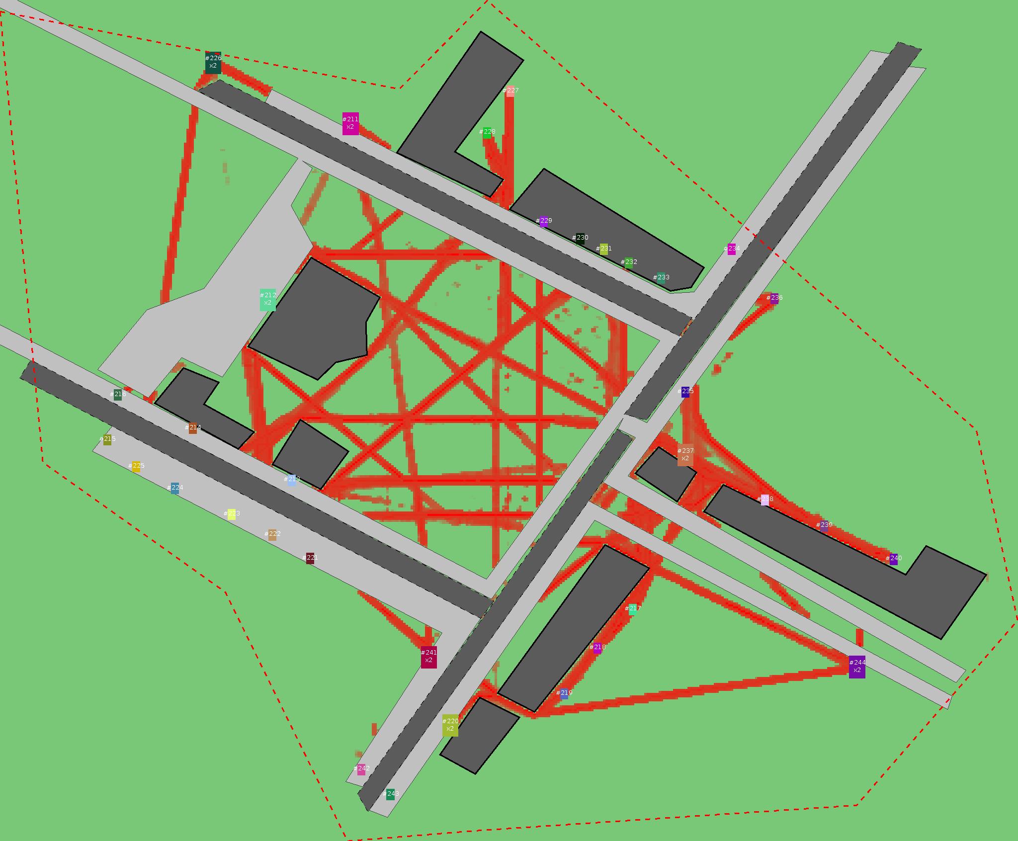 Красным цветом показаны места, где, вероятнее всего, появятся стихийные тропы..