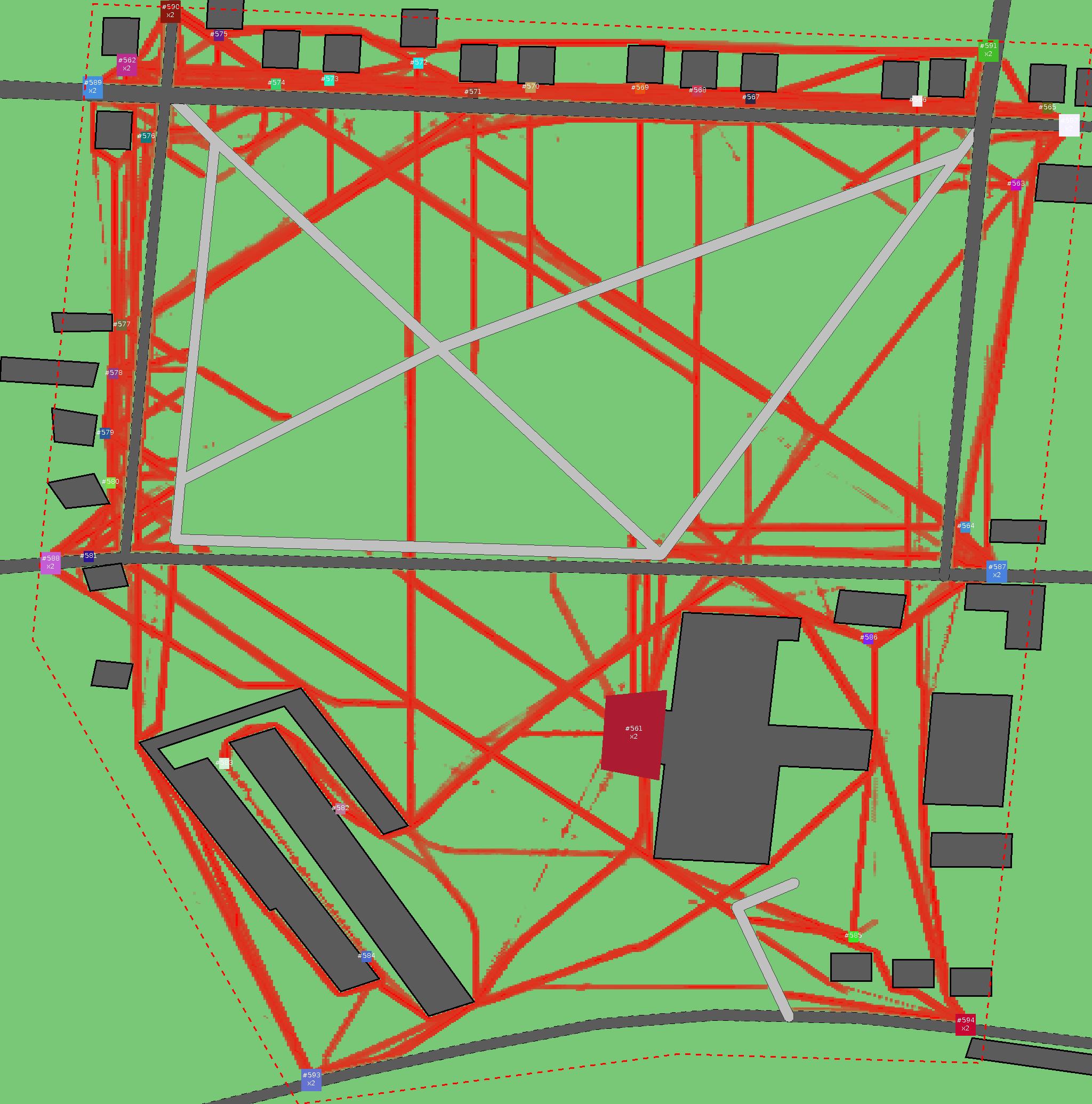Красным цветом показаны места, где, вероятнее всего, появятся стихийные тропы..