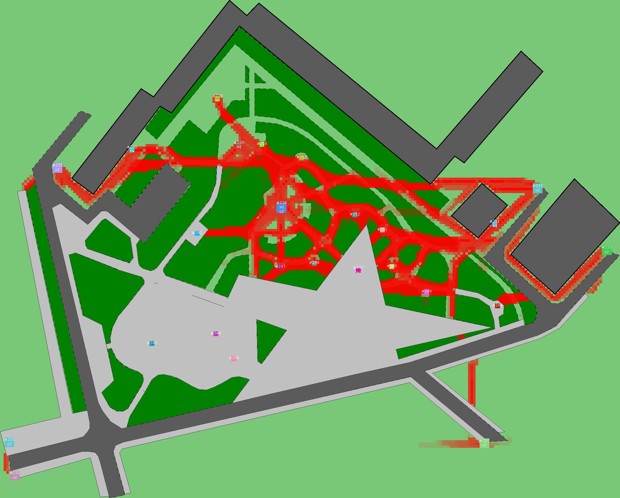 Красным цветом показаны места, где, вероятнее всего, появятся стихийные тропы..