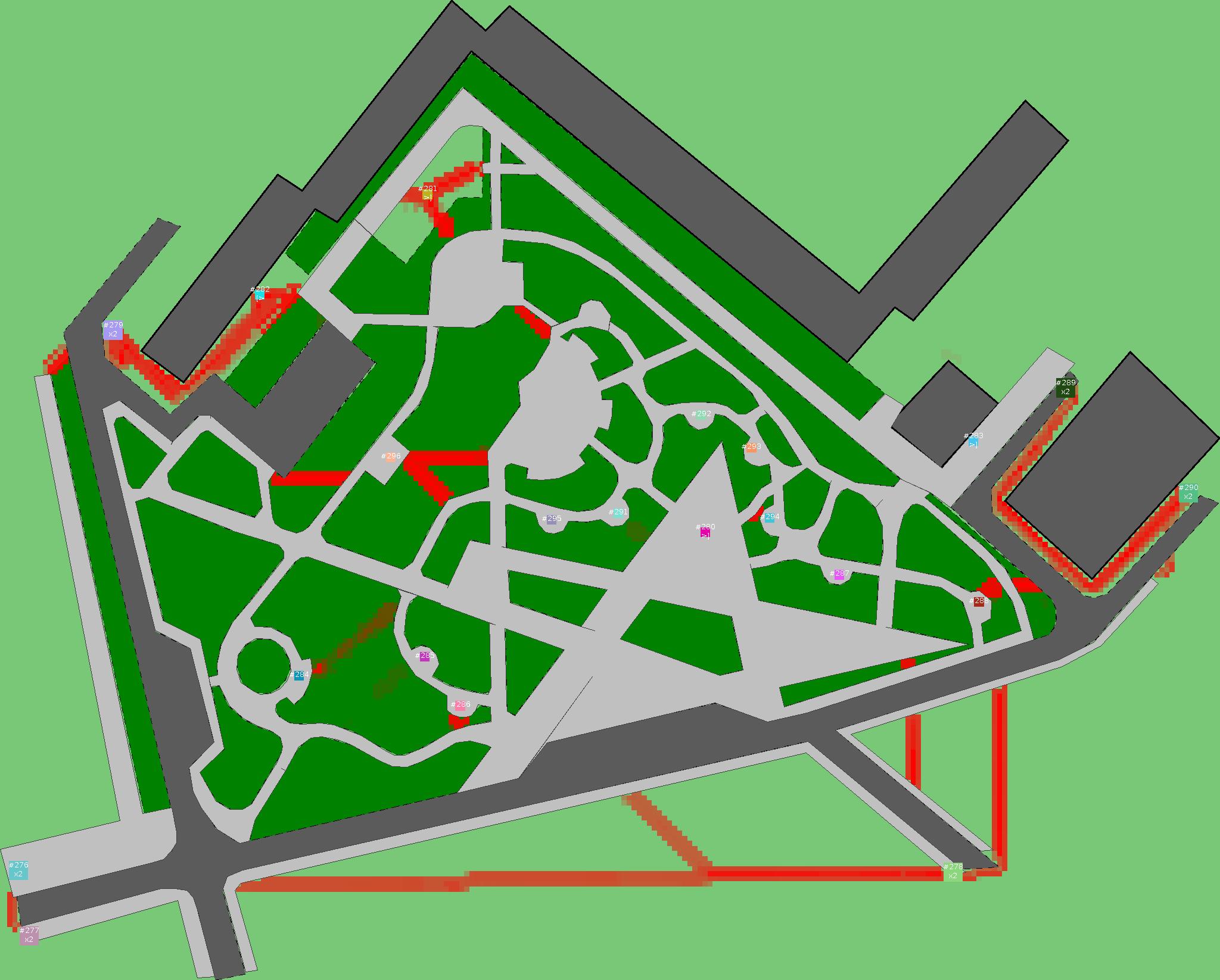 Красным цветом показаны места, где, вероятнее всего, появятся стихийные тропы..