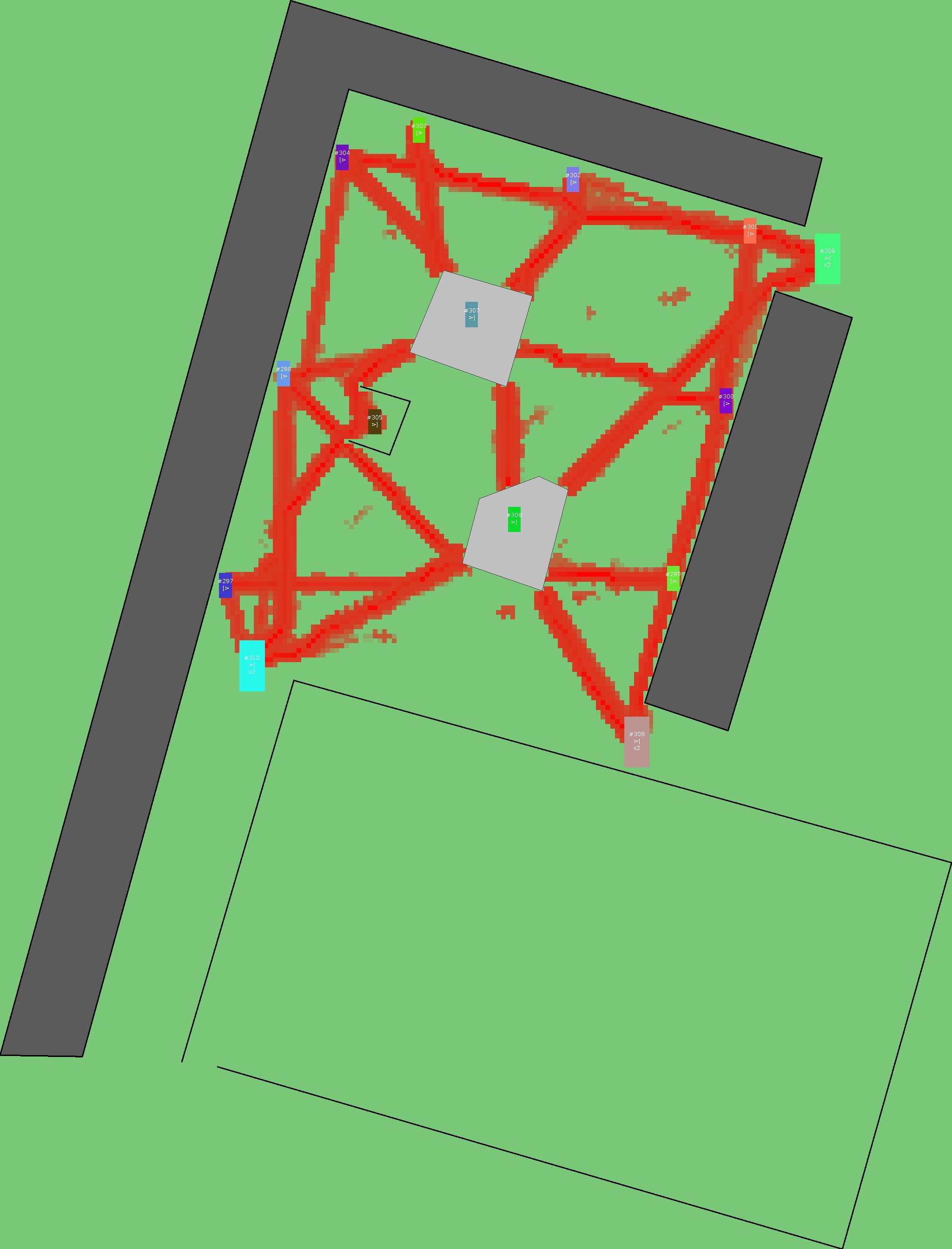 Красным цветом показаны места, где, вероятнее всего, появятся стихийные тропы..