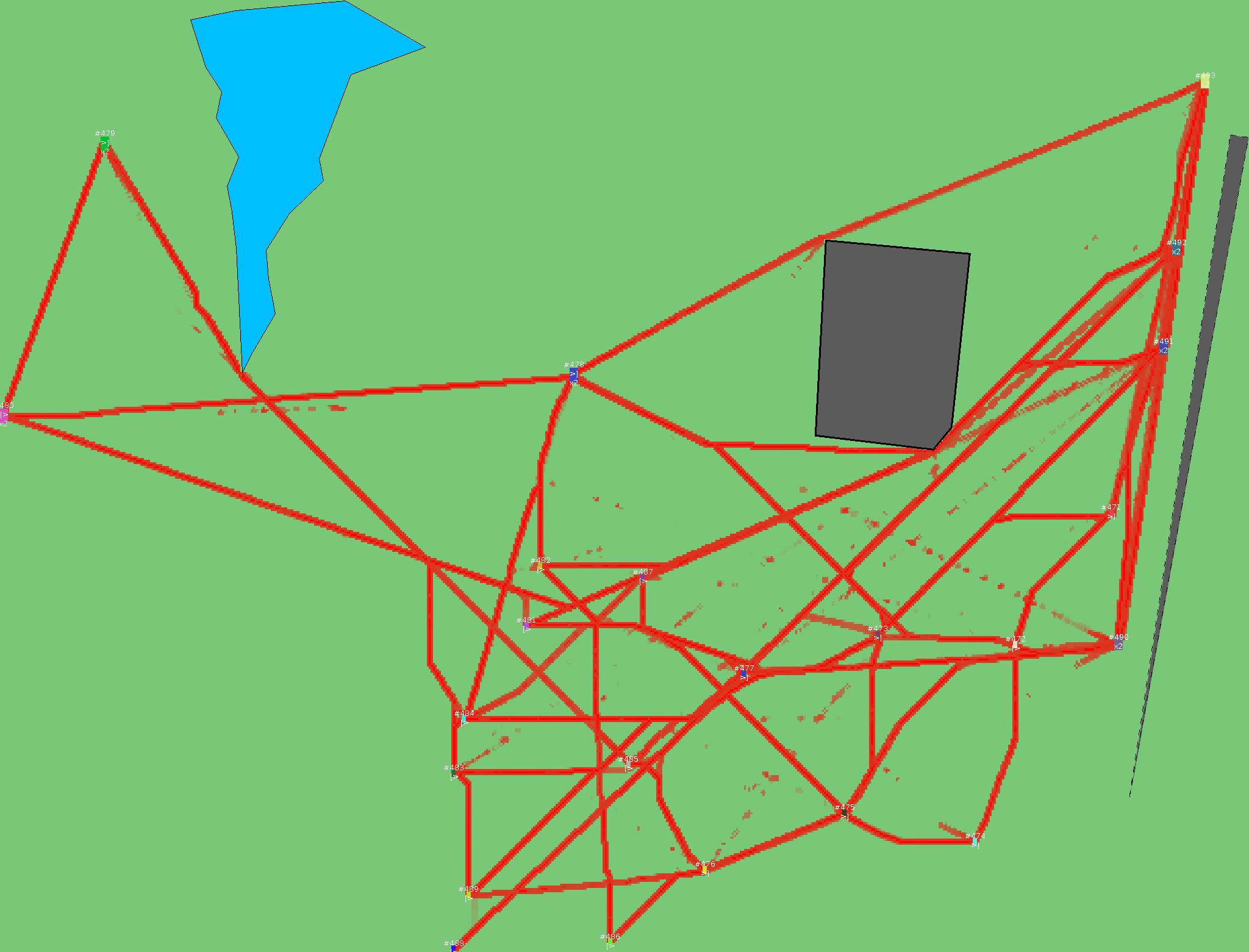 Красным цветом показаны места, где, вероятнее всего, появятся стихийные тропы..