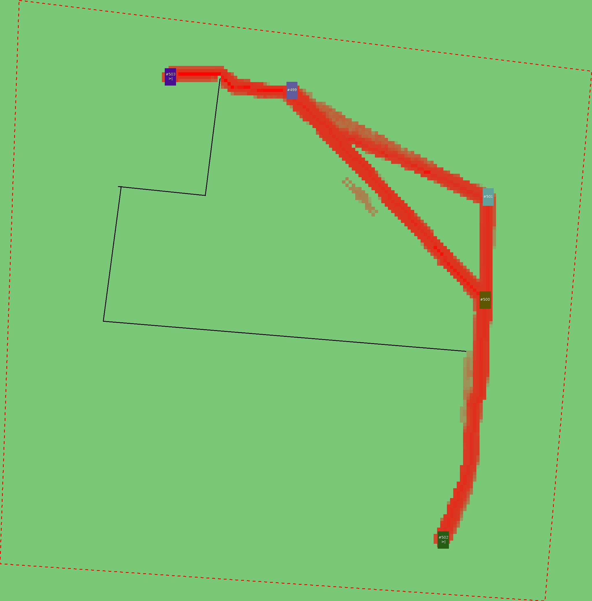 Красным цветом показаны места, где, вероятнее всего, появятся стихийные тропы..