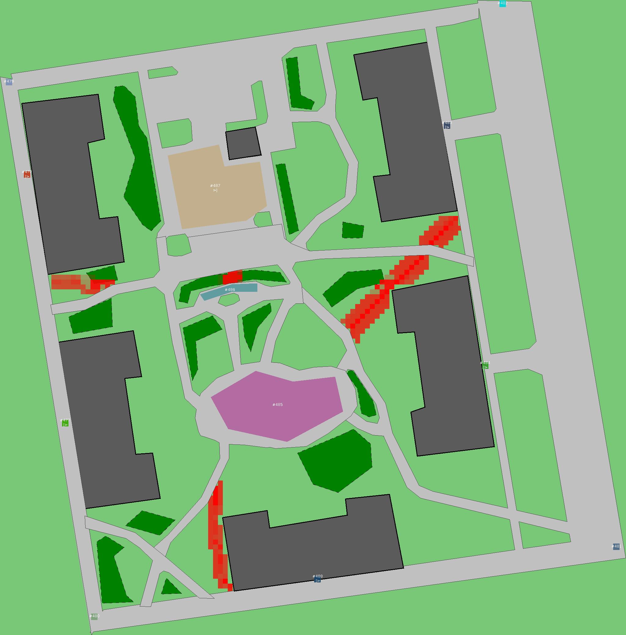 Красным цветом показаны места, где, вероятнее всего, появятся стихийные тропы..