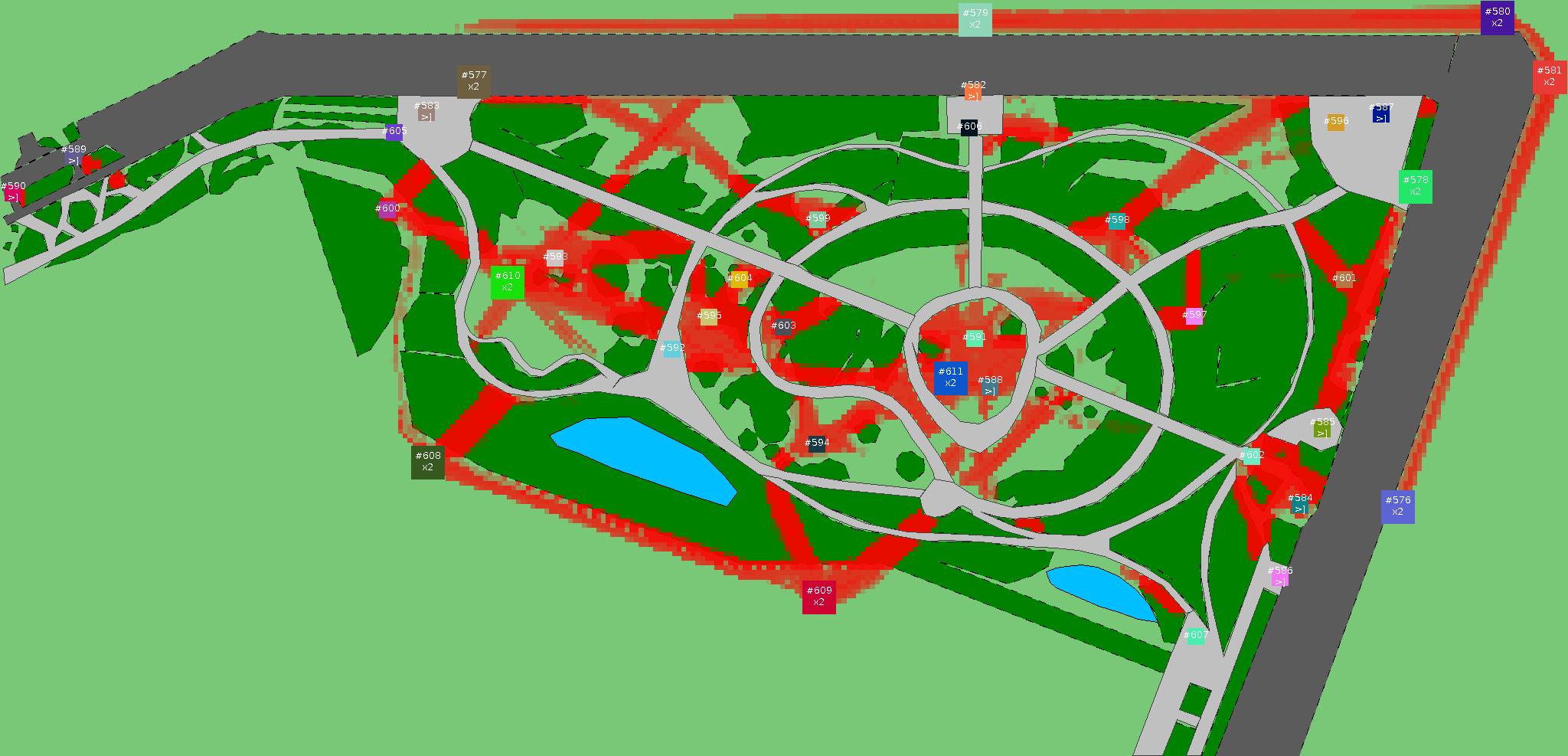 Красным цветом показаны места, где, вероятнее всего, появятся стихийные тропы..
