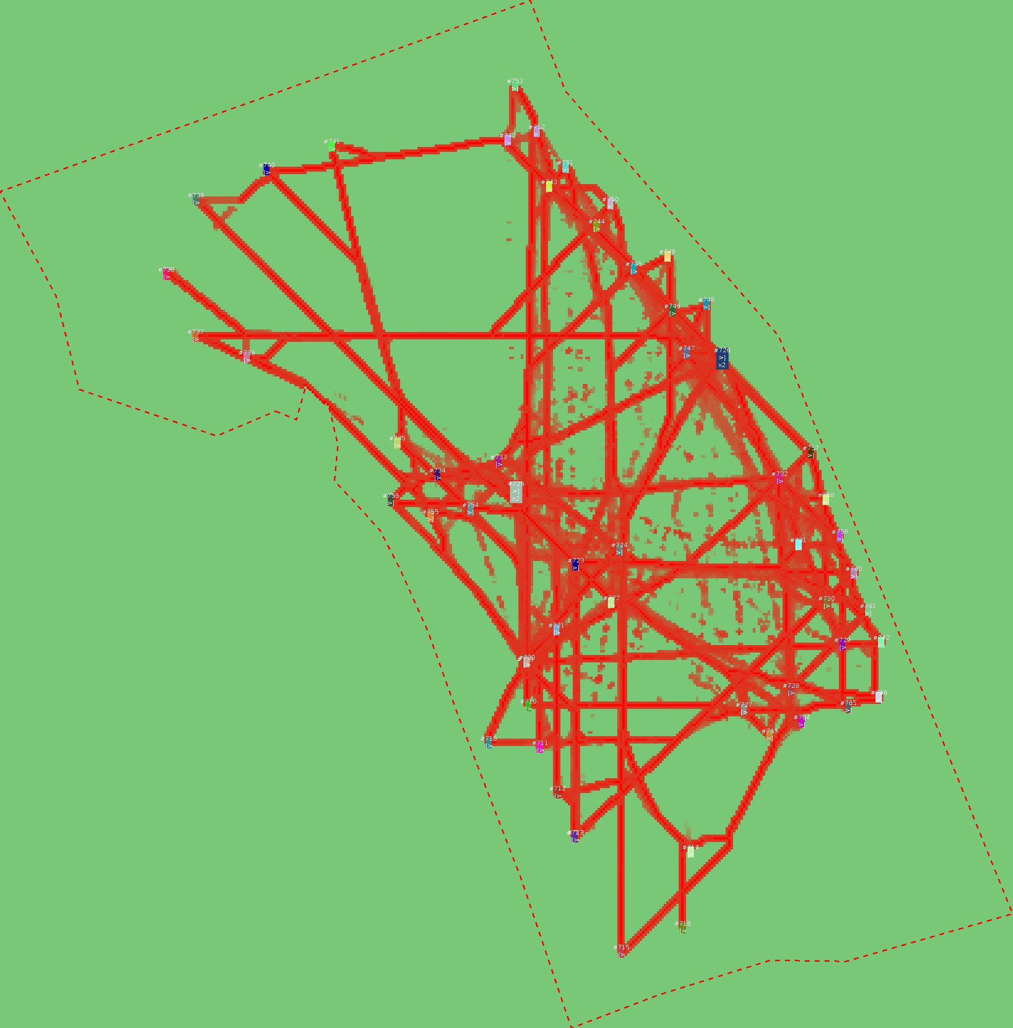 Красным цветом показаны места, где, вероятнее всего, появятся стихийные тропы..