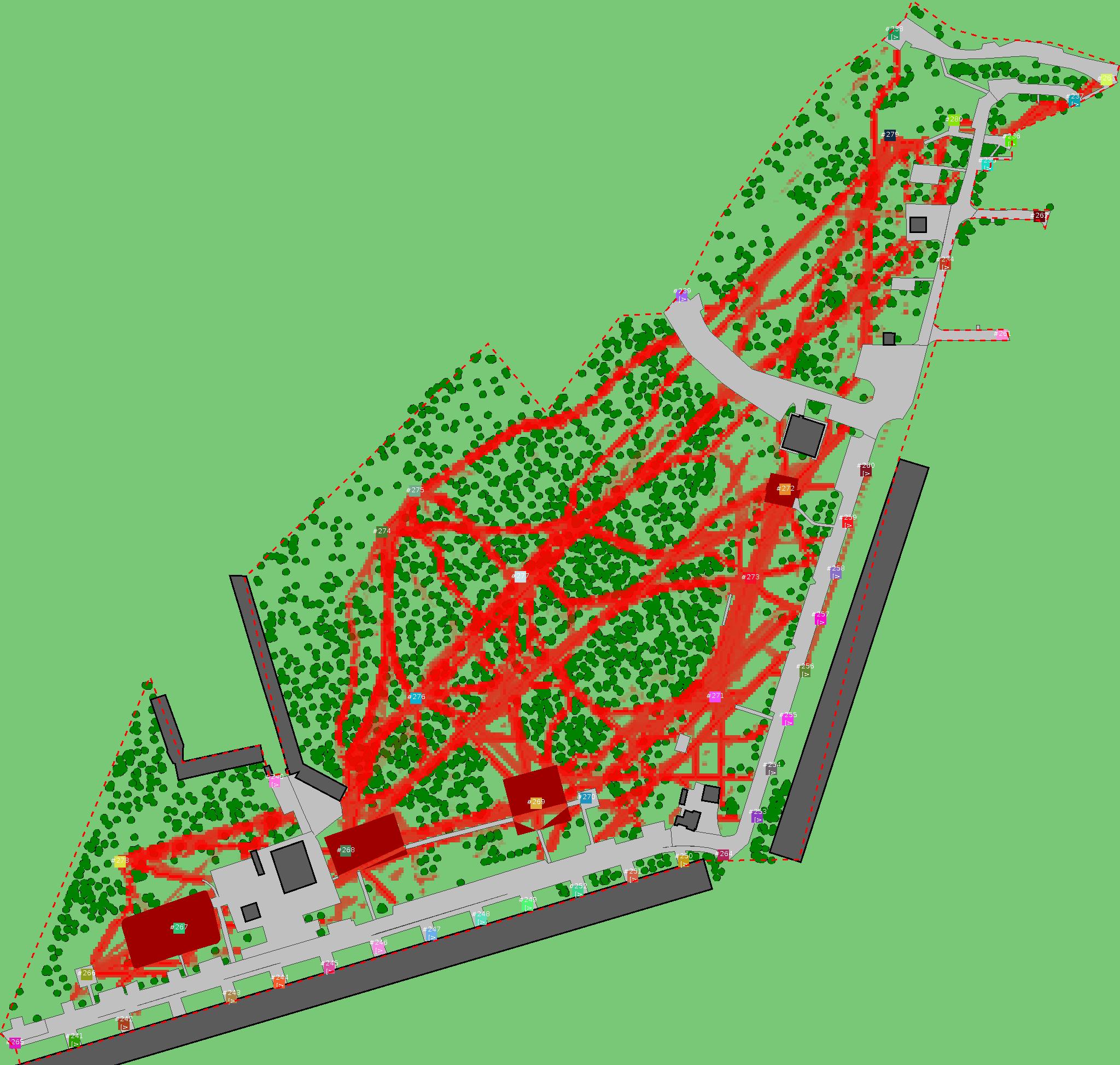Красным цветом показаны места, где, вероятнее всего, появятся стихийные тропы..