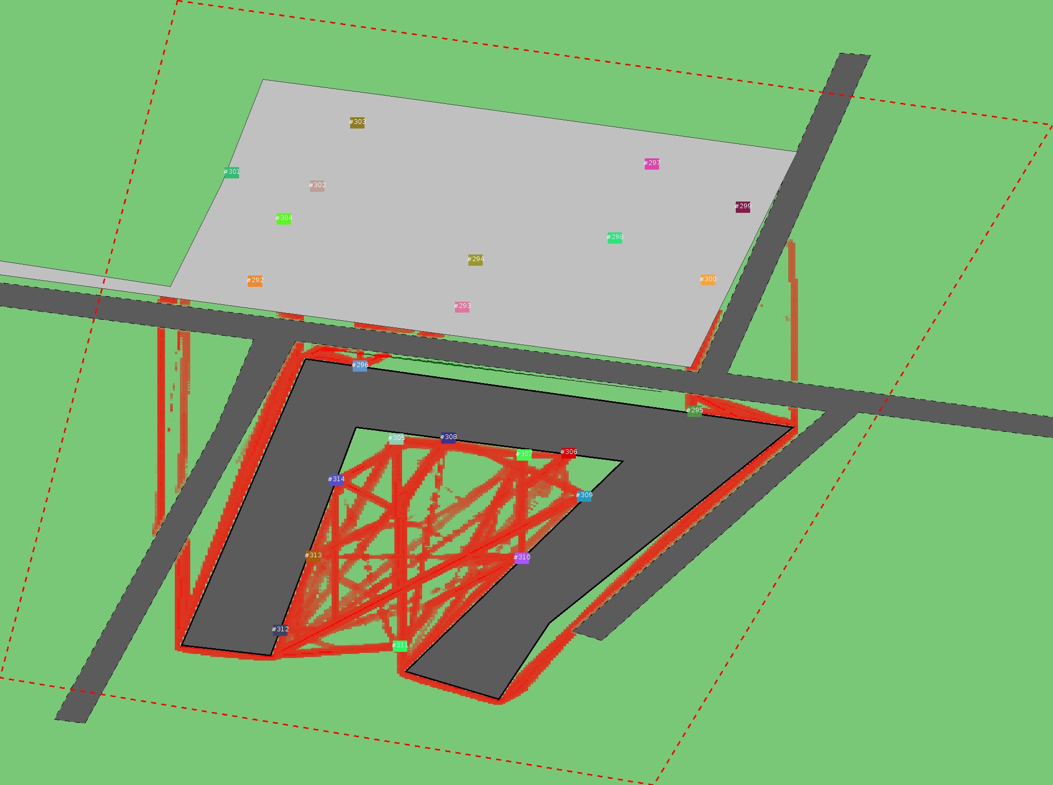 Красным цветом показаны места, где, вероятнее всего, появятся стихийные тропы..