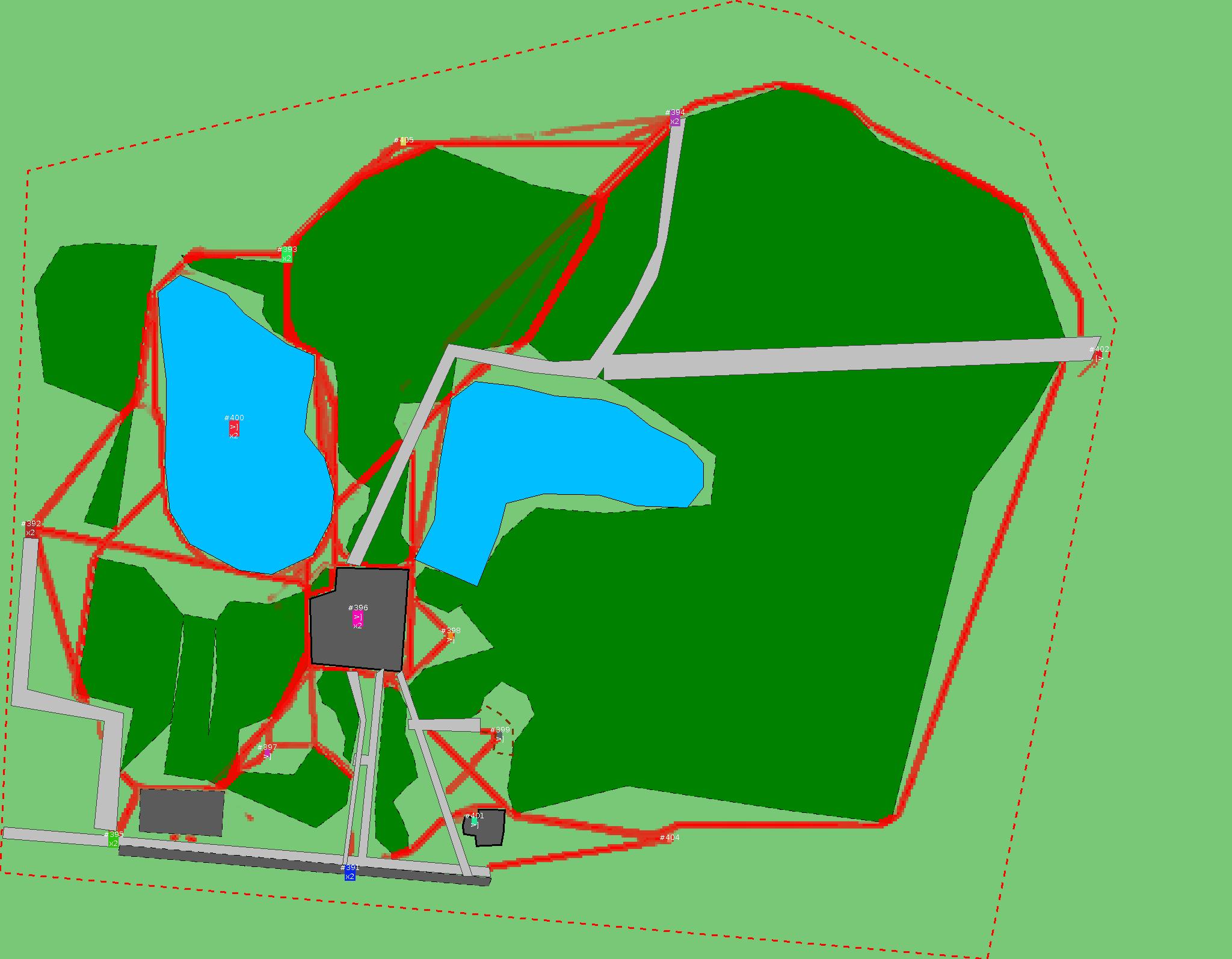 Красным цветом показаны места, где, вероятнее всего, появятся стихийные тропы..