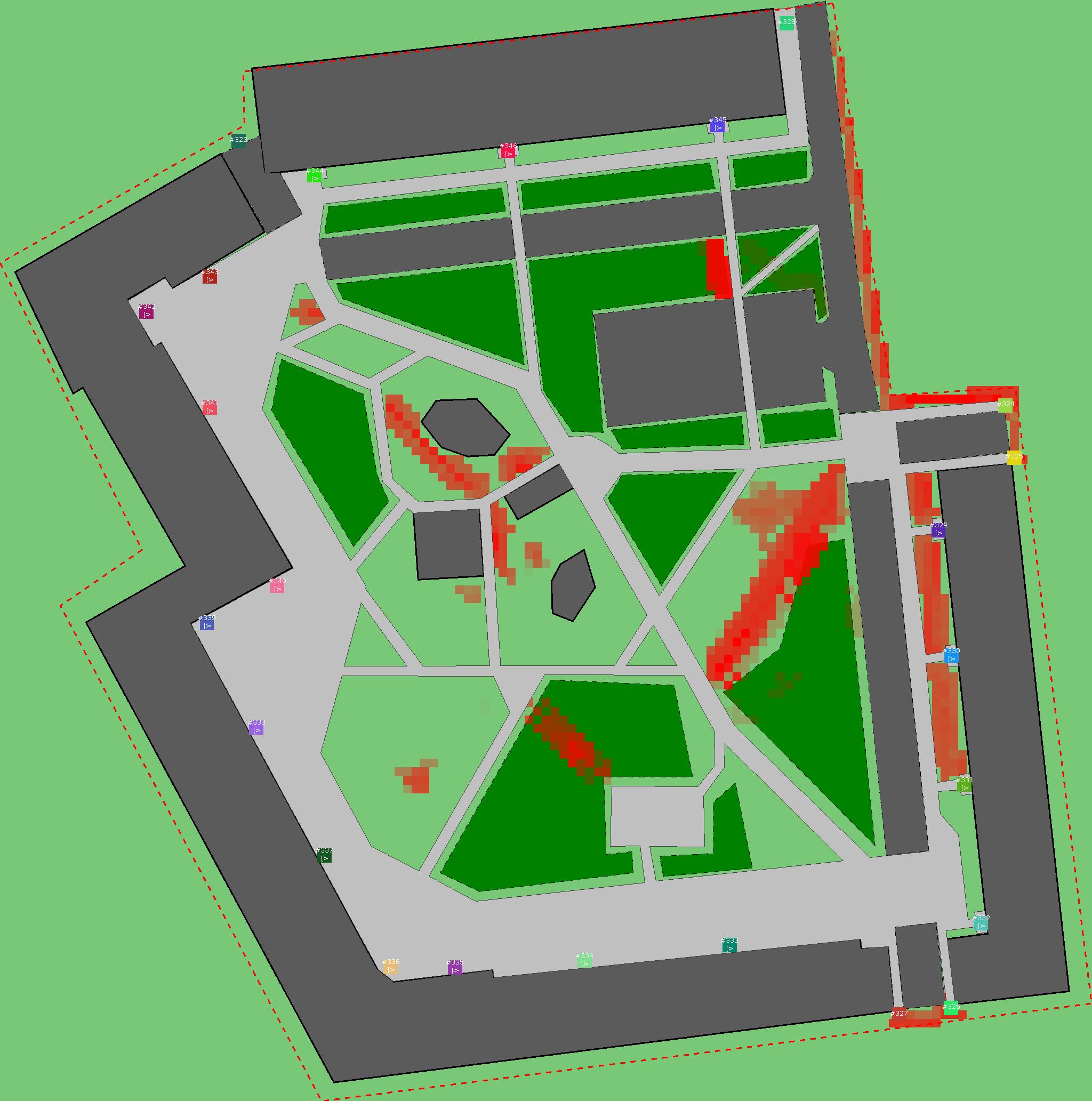 Красным цветом показаны места, где, вероятнее всего, появятся стихийные тропы..