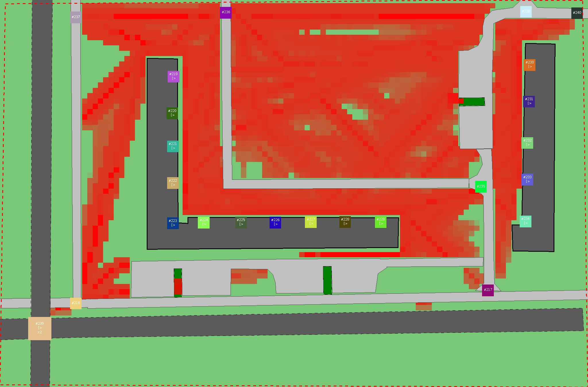 Красным цветом показаны места, где, вероятнее всего, появятся стихийные тропы..