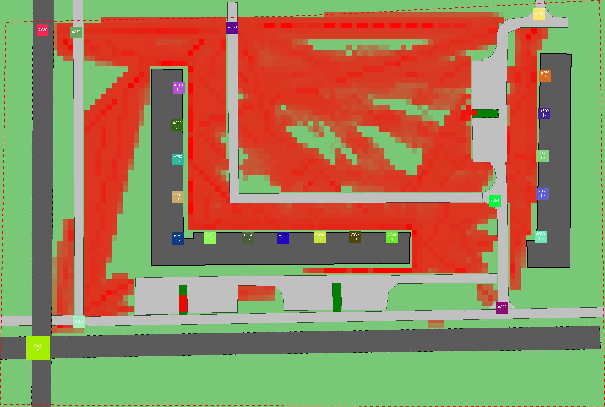 Красным цветом показаны места, где, вероятнее всего, появятся стихийные тропы..