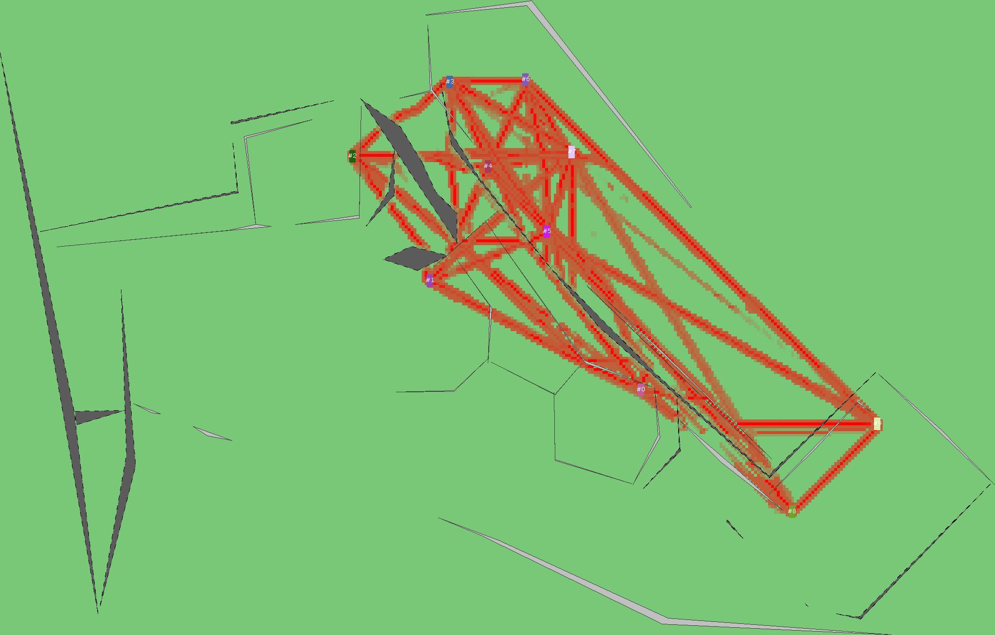 Красным цветом показаны места, где, вероятнее всего, появятся стихийные тропы..