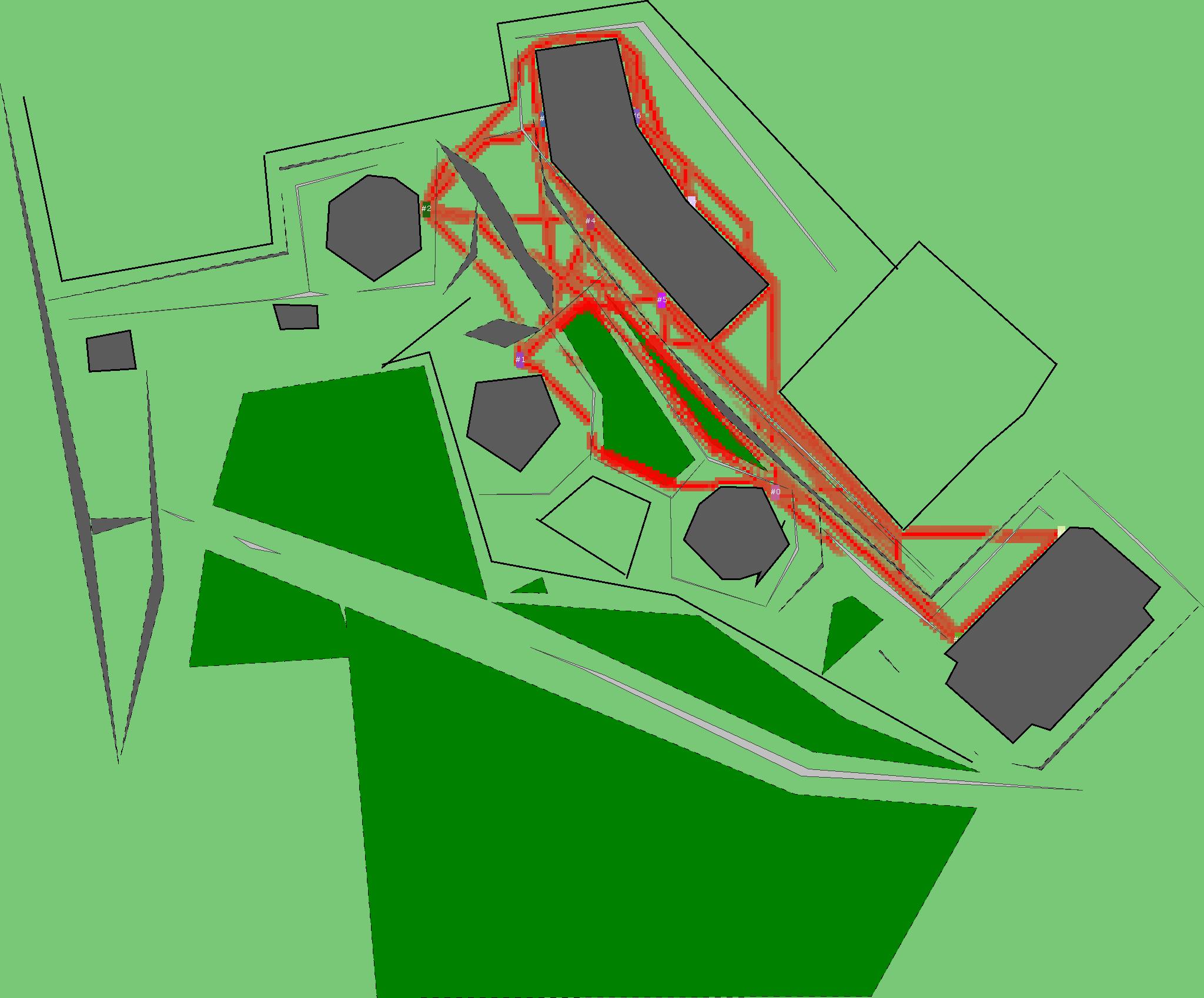 Красным цветом показаны места, где, вероятнее всего, появятся стихийные тропы..