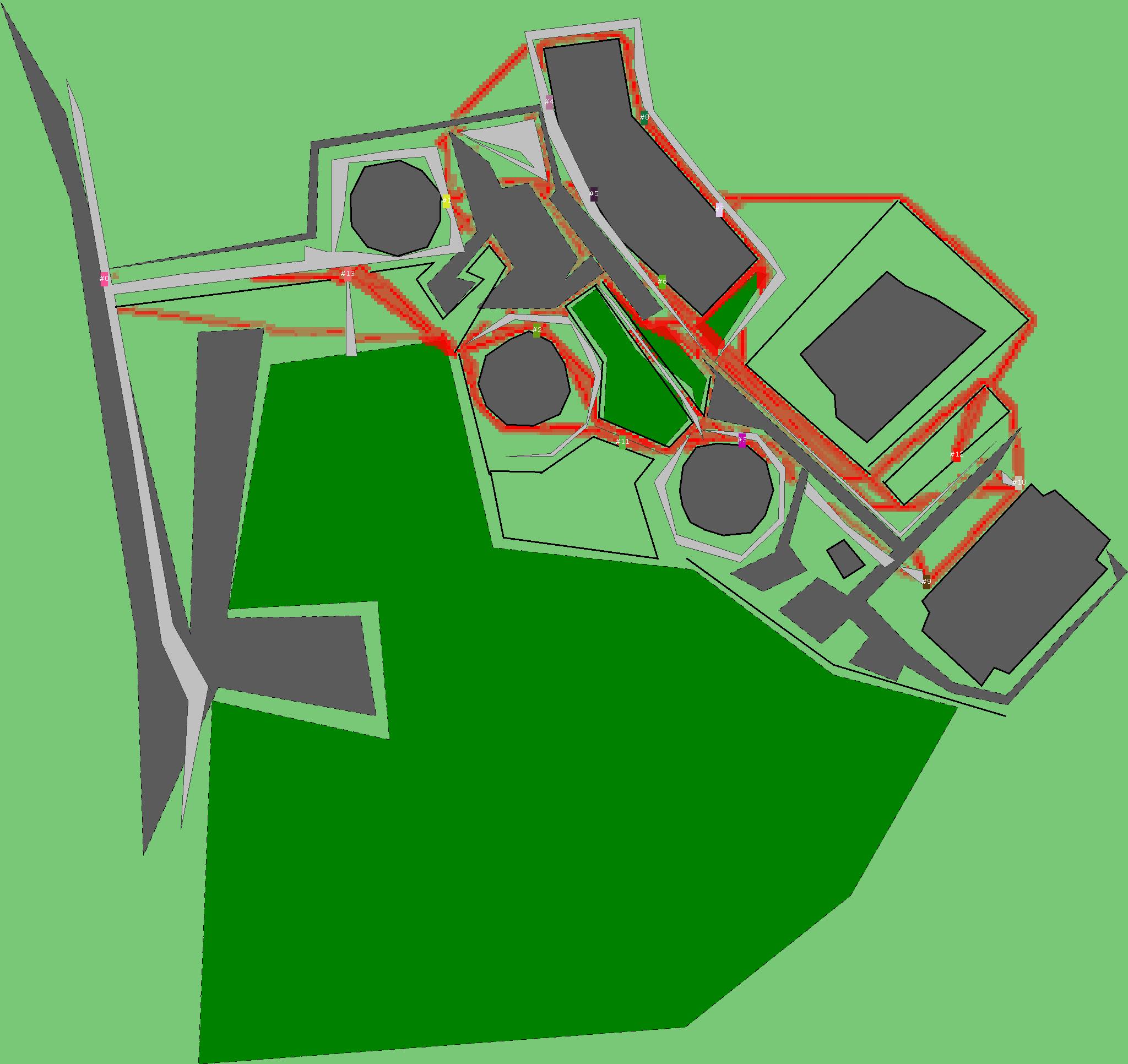 Красным цветом показаны места, где, вероятнее всего, появятся стихийные тропы..
