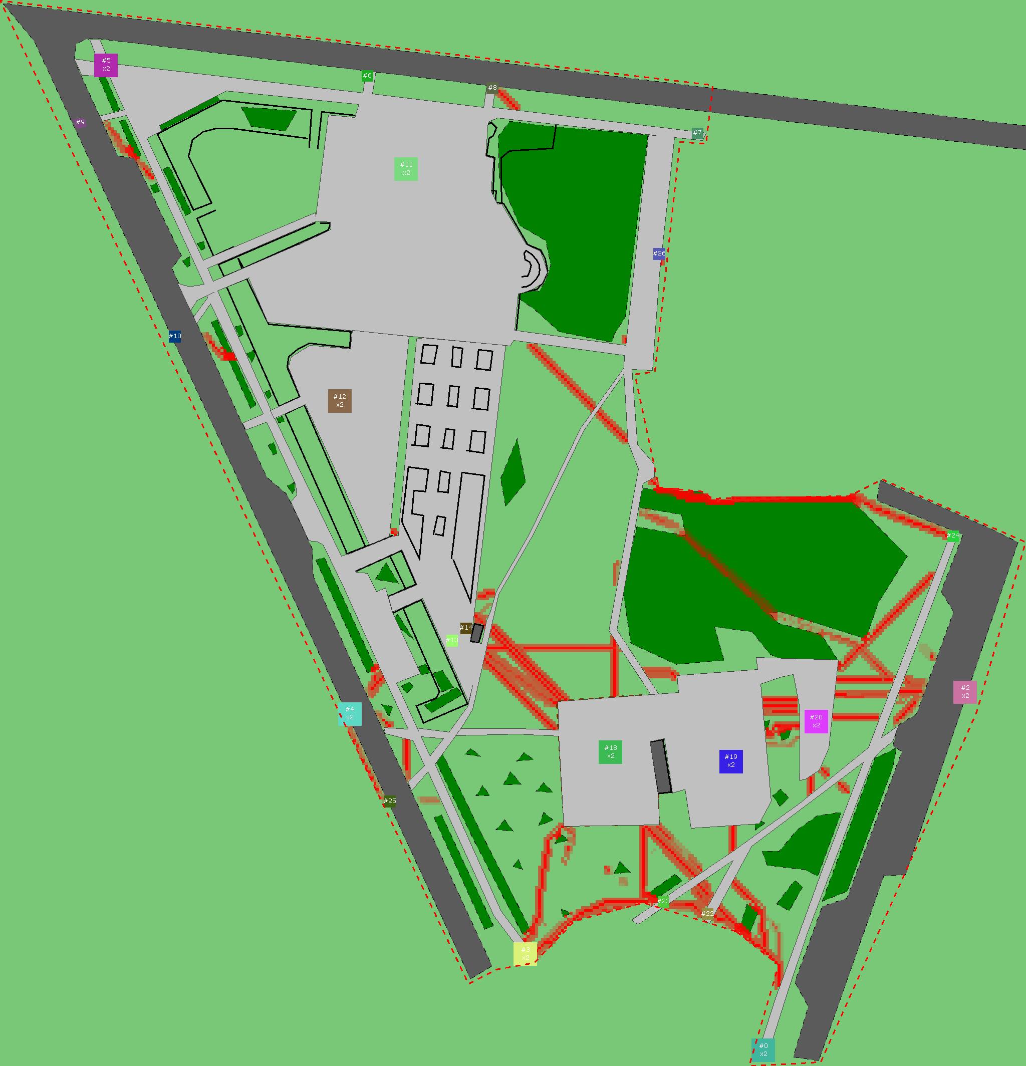 Красным цветом показаны места, где, вероятнее всего, появятся стихийные тропы..