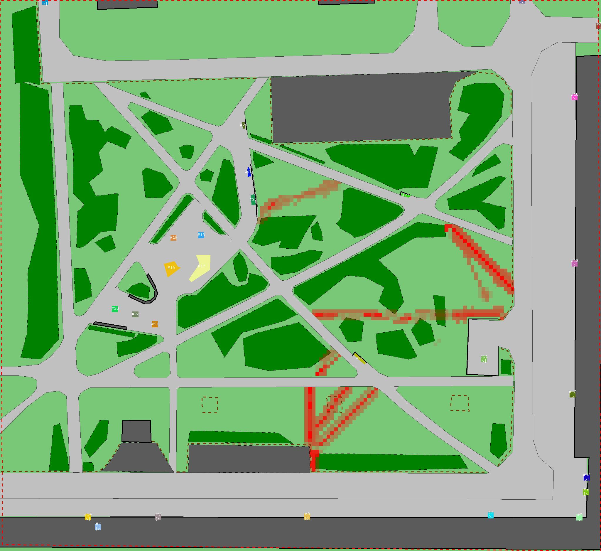 Красным цветом показаны места, где, вероятнее всего, появятся стихийные тропы..