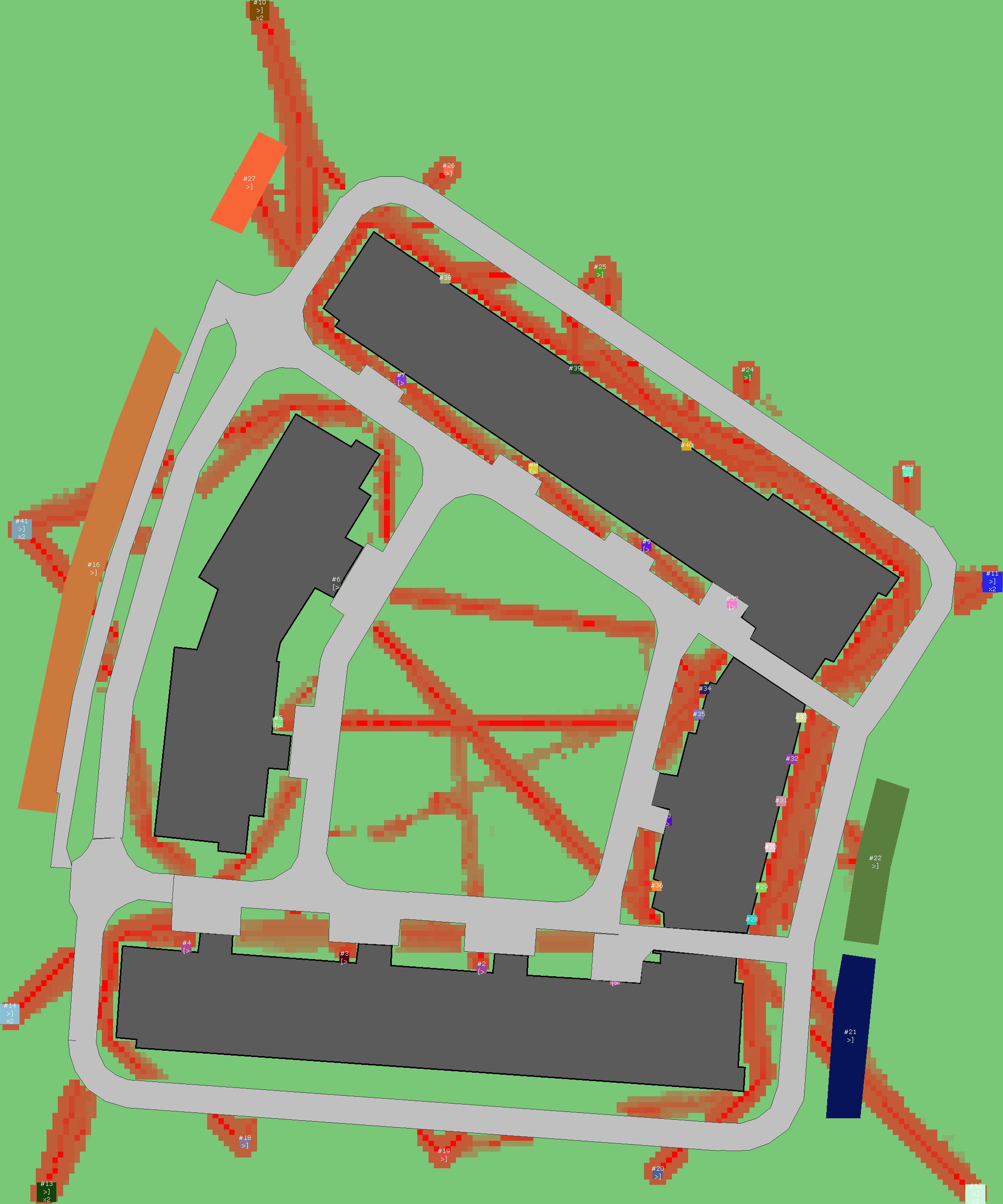 Красным цветом показаны места, где, вероятнее всего, появятся стихийные тропы..