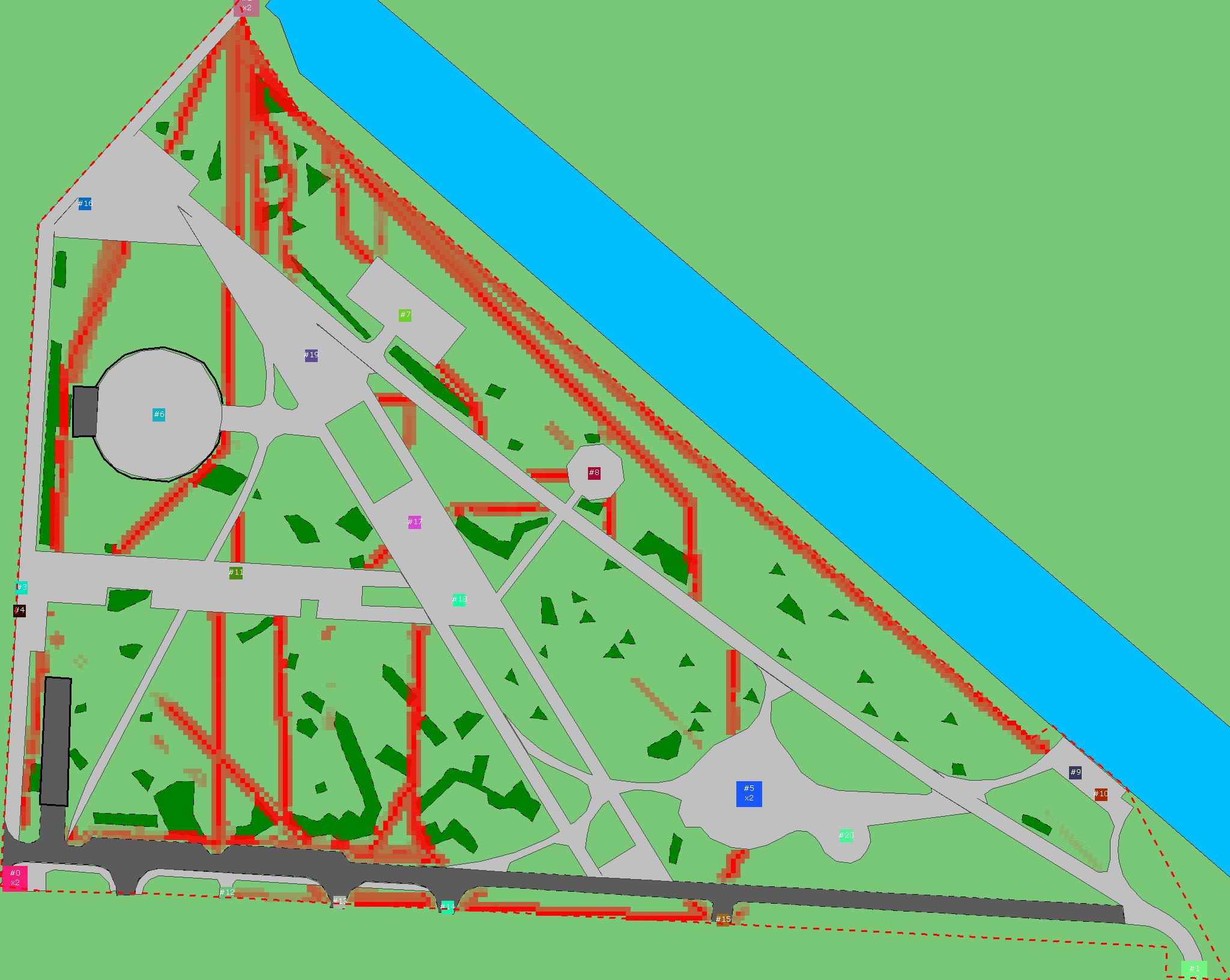 Красным цветом показаны места, где, вероятнее всего, появятся стихийные тропы..