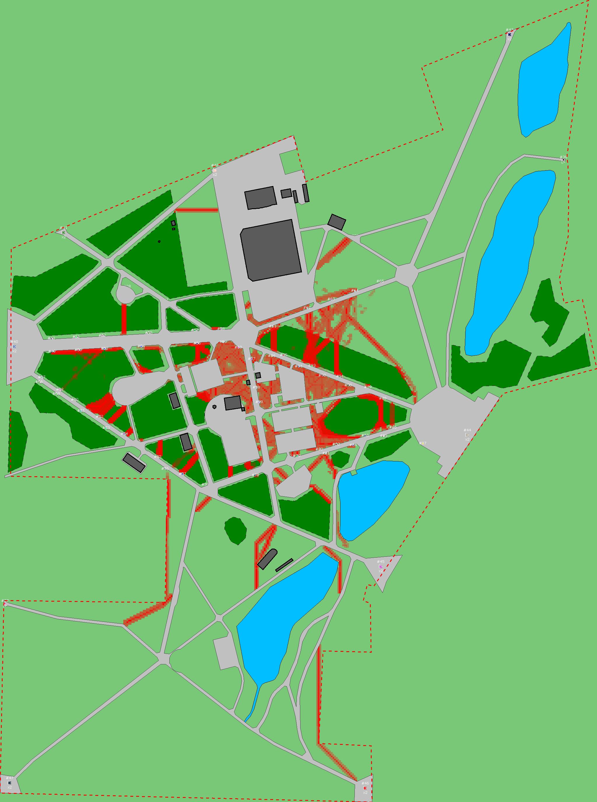 Красным цветом показаны места, где, вероятнее всего, появятся стихийные тропы..
