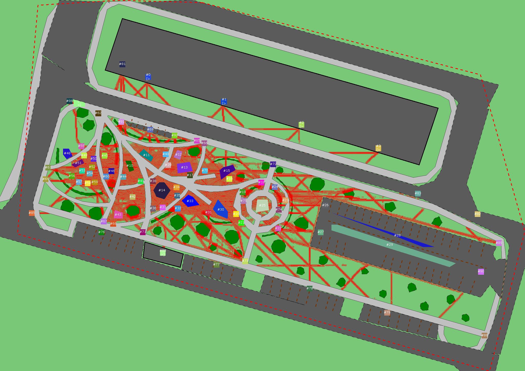 Красным цветом показаны места, где, вероятнее всего, появятся стихийные тропы..