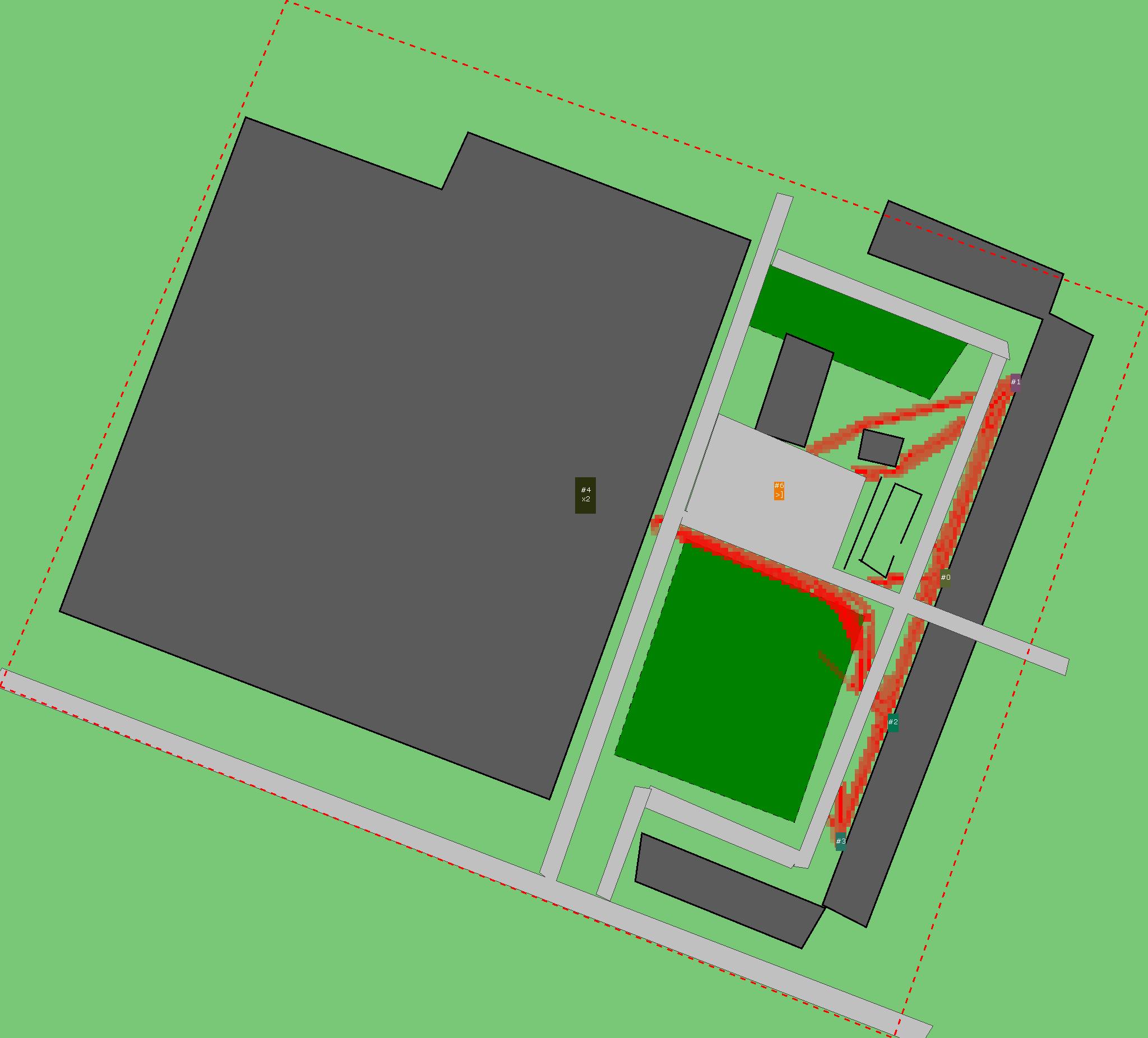 Красным цветом показаны места, где, вероятнее всего, появятся стихийные тропы..